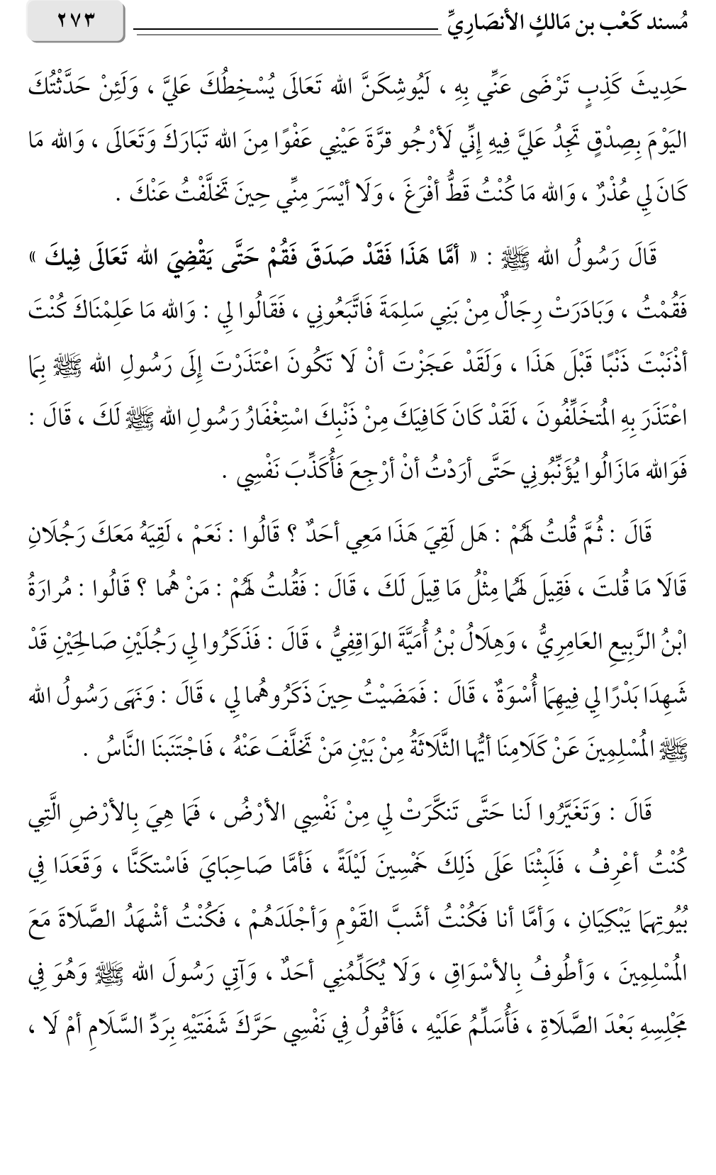 حَدِيثَ كَذِبٍ تَرْضَى عَنِّي بِهِ، لَيُوشِكَنَّ الله تَعَالَى يُسْخِطُكَ عَليَّ، وَلَئِنْ حَدَّثْتُكَ اليَوْمَ بِصِدْقٍ تَجِدُ عَليَّ فِيهِ إِنِّي لَأرْجُو قرَّةَ عَيْنِي عَفْوًا مِنَ الله تَبَارَكَ وَتَعَالَى، وَالله مَا كَانَ لِي عُذْرٌ، وَالله مَا كُنْتُ قَطُّ أفْرَغَ، وَلَا أيْسَرَ مِنِّي حِينَ تَخلَّفْتُ عَنْكَ.