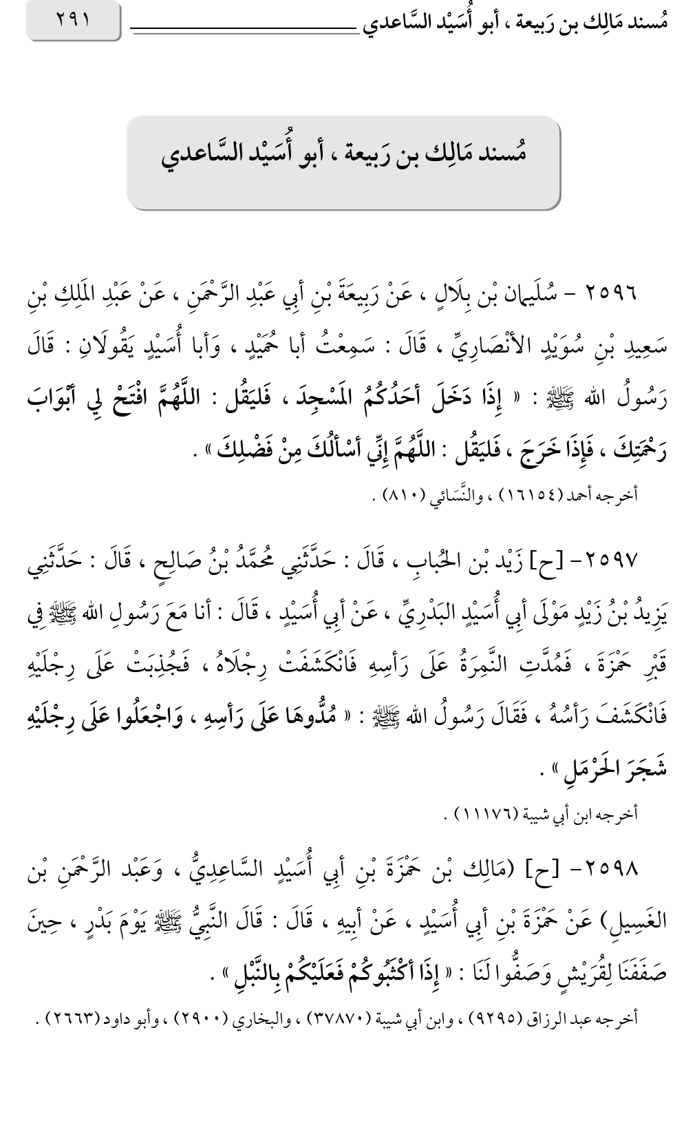 ٢٥٩٦ - سُلَيمان بْن بِلَالٍ، عَنْ رَبِيعَةَ بْنِ أبِي عَبْدِ الرَّحْمَنِ، عَنْ عَبْدِ المَلِكِ بْنِ سَعِيدِ بْنِ سُوَيْدٍ الأنْصَارِيِّ، قَالَ: سَمِعْتُ أبا حُمَيْدٍ، وَأبا أُسَيْدٍ يَقُولَانِ: قَالَ رَسُولُ الله صلى الله عليه وسلم: «إِذَا دَخَلَ أحَدُكُمُ المَسْجِدَ، فَليَقُل: اللَّهُمَّ افْتَحْ لِي أبْوَابَ رَحْمَتِكَ، فَإِذَا خَرَجَ، فَليَقُل: اللَّهُمَّ إِنِّي أسْألُكَ مِنْ فَضْلِكَ».