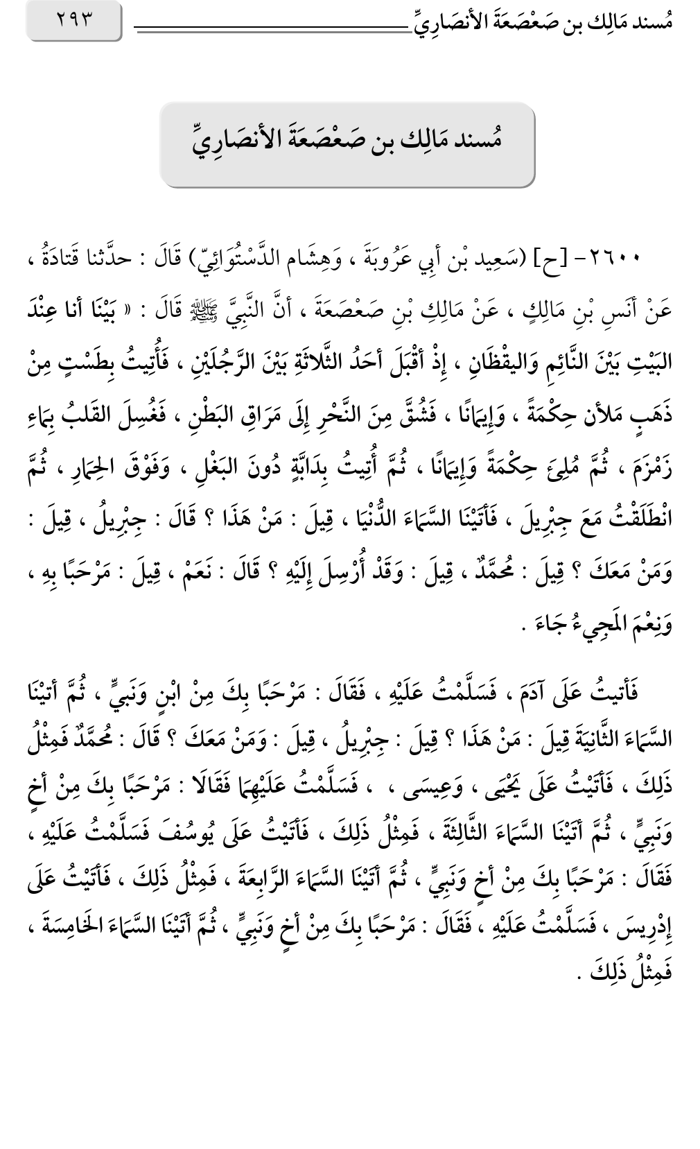 ٢٦٠٠ - [ح] (سَعِيد بْن أبِي عَرُوبَةَ، وَهِشَام الدَّسْتُوَائِيّ) قَالَ: حدَّثنا قَتادَةُ، عَنْ أنَسِ بْنِ مَالِكٍ، عَنْ مَالِكِ بْنِ صَعْصَعَةَ، أنَّ النَّبِيَّ صلى الله عليه وسلم قَالَ: «بَيْنَا أنا عِنْدَ البَيْتِ بَيْنَ النَّائِمِ وَاليقْظَانِ، إِذْ أقْبَلَ أحَدُ الثَّلاثَةِ بَيْنَ الرَّجُلَيْنِ، فَأُتِيتُ بِطَسْتٍ مِنْ ذَهَبٍ مَلأن حِكْمَةً، وَإِيمَانًا، فَشُقَّ مِنَ النَّحْرِ إِلَى مَرَاقِ البَطْنِ، فَغُسِلَ القَلبُ بِمَاءِ زَمْزَمَ، ثُمَّ مُلِئَ حِكْمَةً وَإِيمَانًا، ثُمَّ أُتِيتُ بِدَابَّةٍ دُونَ البَغْلِ، وَفَوْقَ الحِمَارِ، ثُمَّ انْطَلَقْتُ مَعَ جِبْرِيلَ، فَأتَيْنَا السَّمَاءَ الدُّنْيَا، قِيلَ: مَنْ هَذَا؟ قَالَ: جِبْرِيلُ، قِيلَ: وَمَنْ مَعَكَ؟ قِيلَ: مُحمَّدٌ، قِيلَ: وَقَدْ أُرْسِلَ إِلَيْهِ؟ قَالَ: نَعَمْ، قِيلَ: مَرْحَبًا بِهِ، وَنِعْمَ المَجِيءُ جَاءَ.