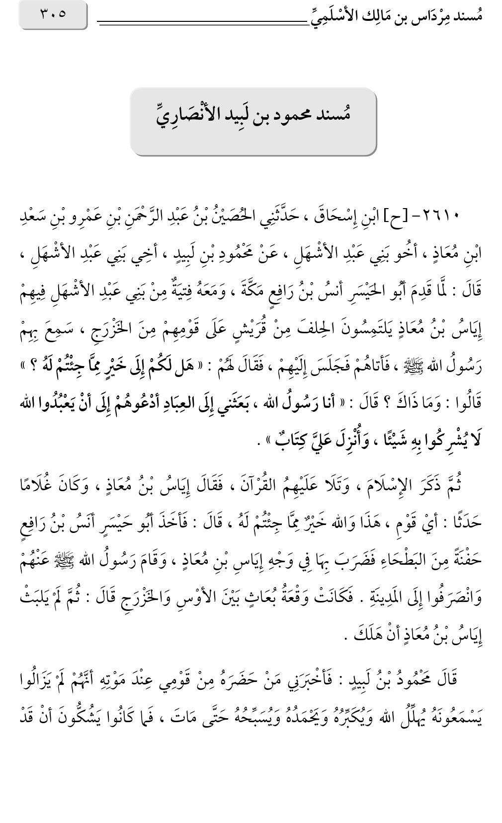 ٢٦١٠ - [ح] ابْنِ إِسْحَاقَ، حَدَّثَنِي الحُصَيْنُ بْنُ عَبْدِ الرَّحْمَنِ بْنِ عَمْرِو بْنِ سَعْدِ ابْنِ مُعَاذٍ، أخُو بَنِي عَبْدِ الأشْهَلِ، عَنْ مَحْمُودِ بْنِ لَبِيدٍ، أخِي بَنِي عَبْدِ الأشْهَلِ، قَالَ: لمَّا قَدِمَ أبُو الحَيْسَرِ أنسُ بْنُ رَافِعٍ مَكَّةَ، وَمَعَهُ فِتيَةٌ مِنْ بَنِي عَبْدِ الأشْهَلِ فِيهِمْ إِيَاسُ بْنُ مُعَاذٍ يَلتَمِسُونَ الحِلفَ مِنْ قُرَيْشٍ عَلَى قَوْمِهِمْ مِنَ الخَزْرَجِ، سَمِعَ بِهِمْ رَسُولُ الله صلى الله عليه وسلم، فَأتاهُمْ فَجَلَسَ إِلَيْهِمْ، فَقَالَ لَهُمْ: «هَل لَكُمْ إِلَى خَيْرٍ مِمَّا جِئْتُمْ لَهُ؟ » قَالُوا: وَمَا ذَاكَ؟ قَالَ: «أنا رَسُولُ الله، بَعَثَني إِلَى العِبَادِ أدْعُوهُمْ إِلَى أنْ يَعْبُدُوا الله لَا يُشْرِكُوا بِهِ شَيْئًا، وَأُنْزِلَ عَليَّ كِتَابٌ».