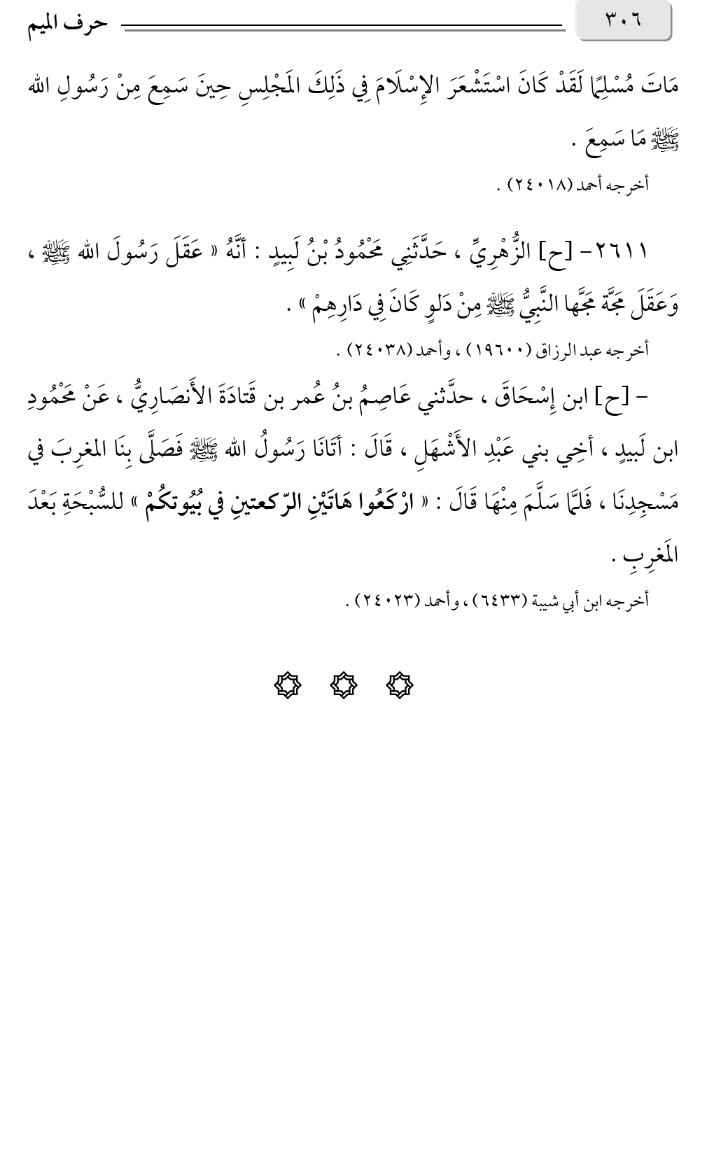 -[ح] ابن إِسْحَاقَ، حدَّثني عَاصِمُ بنُ عُمر بن قَتادَةَ الأَنصَارِيُّ، عَنْ مَحْمُودِ ابن لَبيدٍ، أخِي بني عَبْدِ الأَشْهَلِ، قَالَ: أتَانَا رَسُولُ الله صلى الله عليه وسلم فَصَلَّى بِنَا المغرِبَ في مَسْجِدِنَا، فَلمَّا سَلَّمَ مِنْهَا قَالَ: «ارْكَعُوا هَاتَيْنِ الرّكعتينِ في بُيُوتكُمْ» للسُّبْحَةِ بَعْدَ المَغرِبِ.