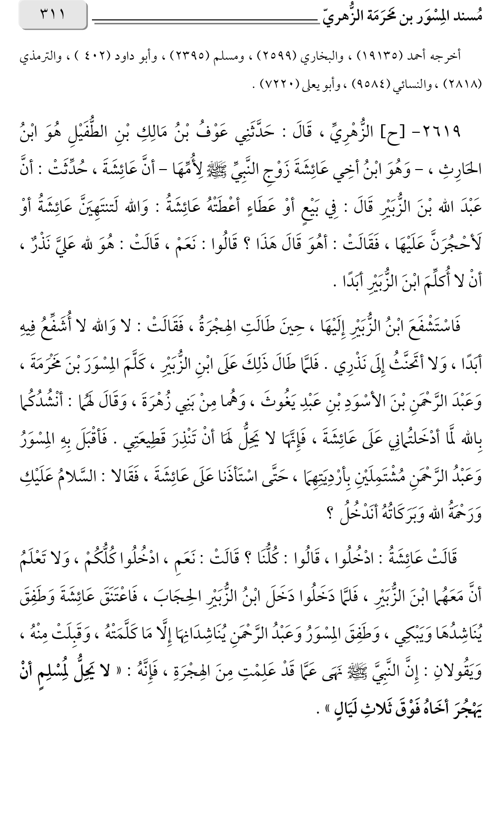 فَاسْتَشْفَعَ ابْنُ الزُّبَيْرِ إِلَيْهَا، حِينَ طَالَتِ الهِجْرَةُ، فَقَالَتْ: لا وَالله لا أُشَفِّعُ فِيهِ أبَدًا، وَلا أتَحنَّثُ إِلَى نَذْرِي. فَلمَّا طَالَ ذَلِكَ عَلَى ابْنِ الزُّبَيْرِ، كَلَّمَ المِسْوَرَ بْنَ مَخْرَمَةَ، وَعَبْدَ الرَّحْمَنِ بْنَ الأسْوَدِ بْنِ عَبْدِ يَغُوثَ، وَهُما مِنْ بَنِي زُهْرَةَ، وَقَالَ لَهُما: أنْشُدُكُما بِالله لمَّا أدْخَلتُمانِي عَلَى عَائِشَةَ، فَإِنَّهَا لا يَحِلُّ لَهَا أنْ تَنْذِرَ قَطِيعَتِي. فَأقْبَلَ بِهِ المِسْوَرُ وَعَبْدُ الرَّحْمَنِ مُشْتَمِلَيْنِ بِأرْدِيَتِهِمَا، حَتَّى اسْتَأذَنا عَلَى عَائِشَةَ، فَقَالا: السَّلامُ عَلَيْكِ وَرَحْمَةُ الله وَبَرَكَاتُهُ أنَدْخُلُ؟