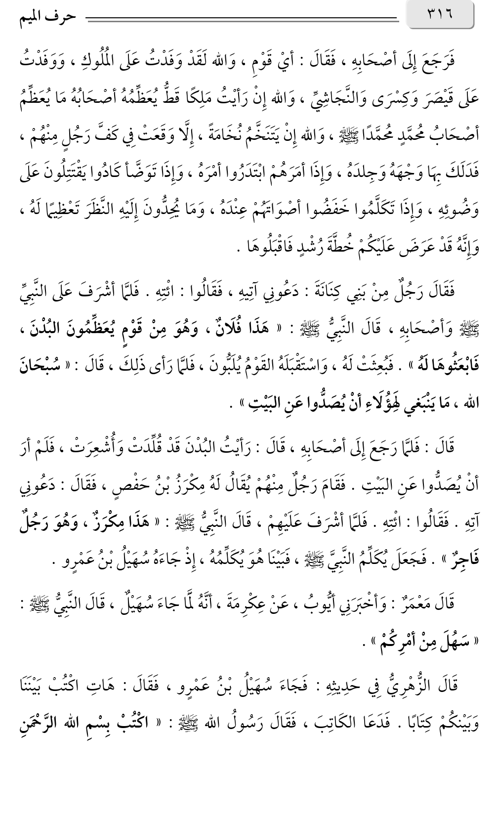 قَالَ الزُّهْرِيُّ فِي حَدِيثِهِ: فَجَاءَ سُهَيْلُ بْنُ عَمْرٍو، فَقَالَ: هَاتِ اكْتُبْ بَيْنَنَا وَبَيْنكُمْ كِتَابًا. فَدَعَا الكَاتِبَ، فَقَالَ رَسُولُ الله صلى الله عليه وسلم: «اكْتُبْ بِسْمِ الله الرَّحْمَنِ