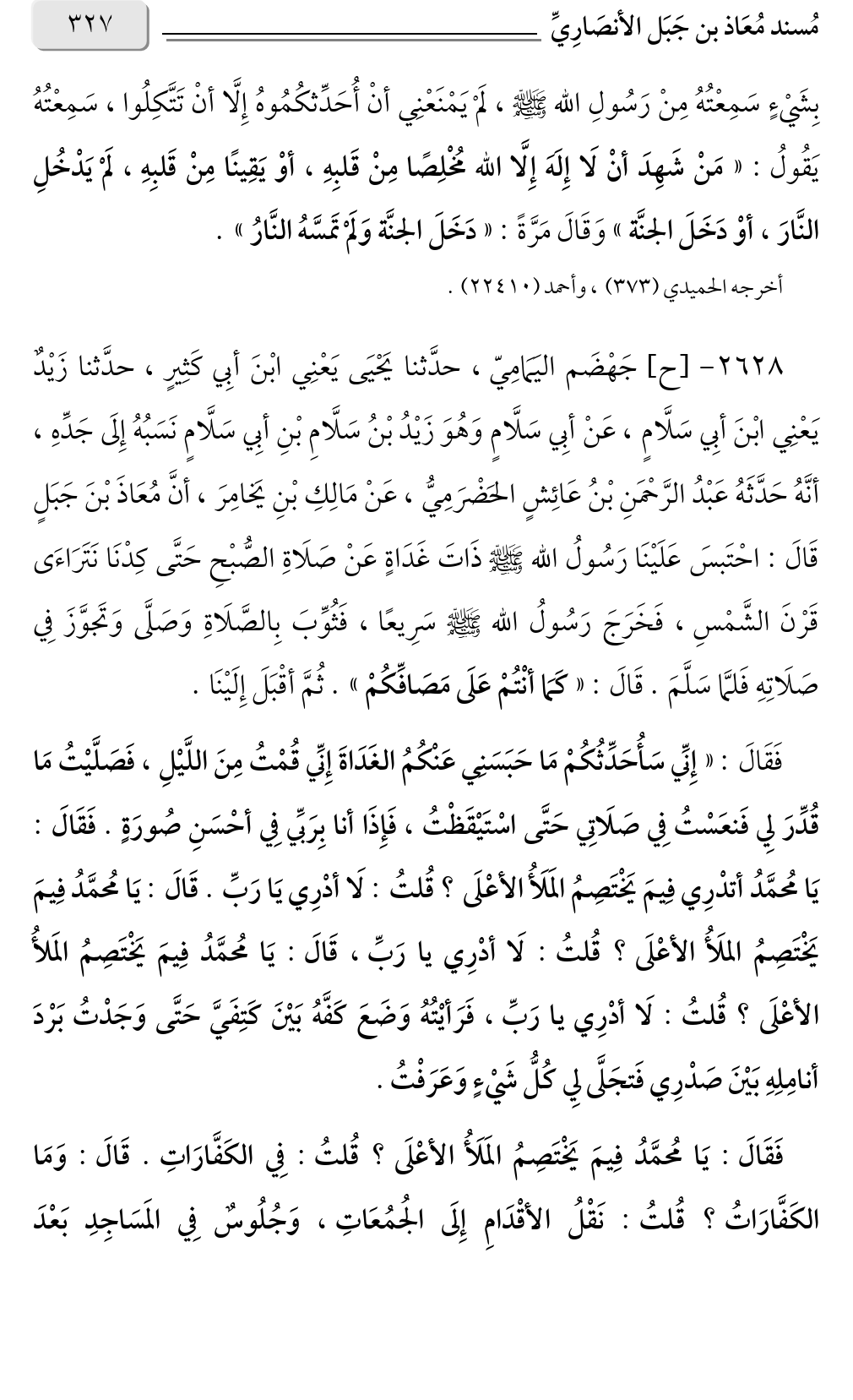 فَقَالَ: «إِنِّي سَأُحَدِّثُكُمْ مَا حَبَسَنِي عَنْكُمُ الغَدَاةَ إِنِّي قُمْتُ مِنَ اللَّيْلِ، فَصَلَّيْتُ مَا قُدِّرَ لِي فَنعَسْتُ فِي صَلَاتِي حَتَّى اسْتَيْقَظْتُ، فَإِذَا أنا بِرَبِّي فِي أحْسَنِ صُورَةٍ. فَقَالَ: يَا مُحمَّدُ أتدْرِي فِيمَ يَخْتَصِمُ المَلَأُ الأعْلَى؟ قُلتُ: لَا أدْرِي يَا رَبِّ. قَالَ: يَا مُحمَّدُ فِيمَ يَخْتَصِمُ الملَأُ الأعْلَى؟ قُلتُ: لَا أدْرِي يا رَبِّ، قَالَ: يَا مُحمَّدُ فِيمَ يَخْتَصِمُ المَلأُ الأعْلَى؟ قُلتُ: لَا أدْرِي يا رَبِّ، فَرَأيْتُهُ وَضَعَ كَفَّهُ بَيْنَ كَتِفَيَّ حَتَّى وَجَدْتُ بَرْدَ أنامِلِهِ بَيْنَ صَدْرِي فَتجَلَّى لِي كُلُّ شَيْءٍ وَعَرَفْتُ.