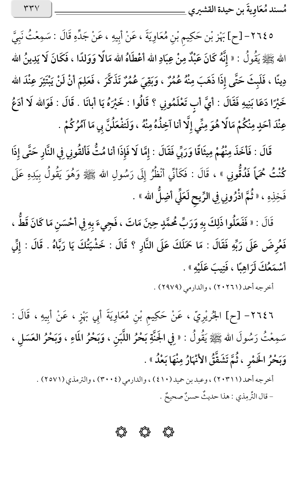 ٢٦٤٦ - [ح] الجُريْرِيّ، عَنْ حَكِيمِ بْنِ مُعَاوِيَةَ أبِي بَهْزٍ، عَنْ أبِيهِ، قَالَ: سَمِعْتُ رَسُولَ الله صلى الله عليه وسلم يَقُولُ: «فِي الجَنَّةِ بَحْرُ اللَّبَنِ، وَبَحْرُ المَاءِ، وَبَحْرُ العَسَلِ، وَبَحْرُ الخَمْرِ، ثُمَّ تَشَقَّقُ الأنْهَارُ مِنْهَا بَعْدُ».