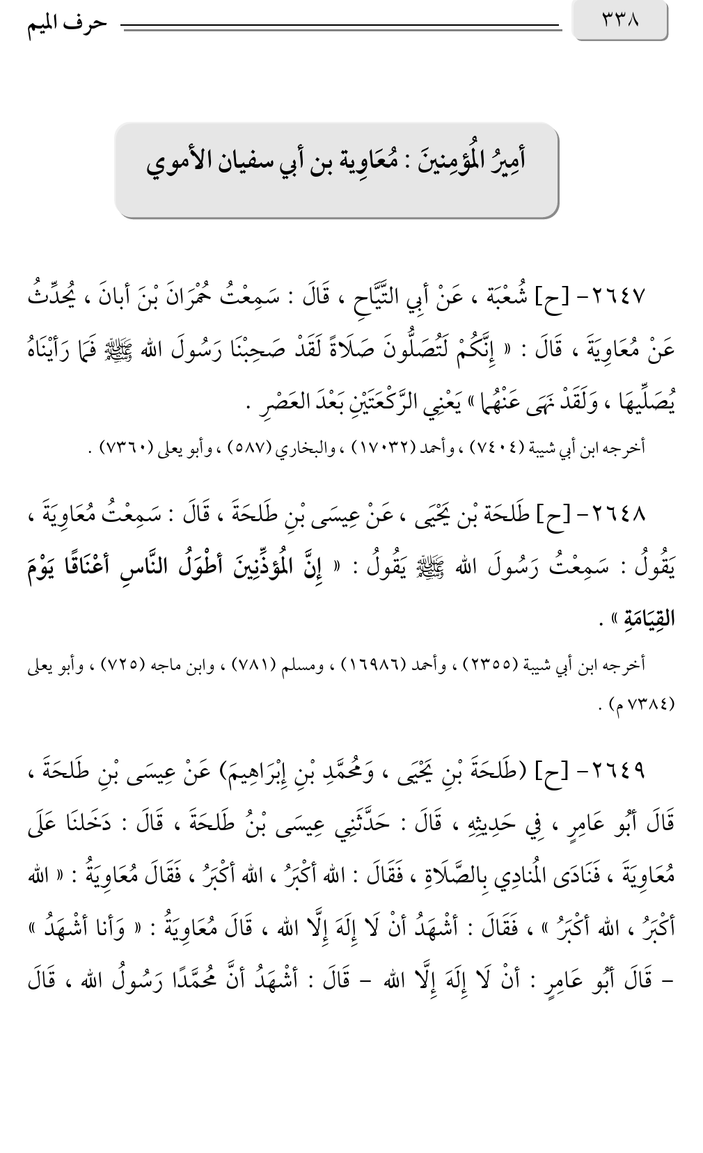 ٢٦٤٨ - [ح] طَلحَة بْن يَحْيَى، عَنْ عِيسَى بْنِ طَلحَةَ، قَالَ: سَمِعْتُ مُعَاوِيَةَ، يَقُولُ: سَمِعْتُ رَسُولَ الله صلى الله عليه وسلم يَقُولُ: «إِنَّ المُؤذِّنِينَ أطْوَلُ النَّاسِ أعْنَاقًا يَوْمَ القِيَامَةِ».