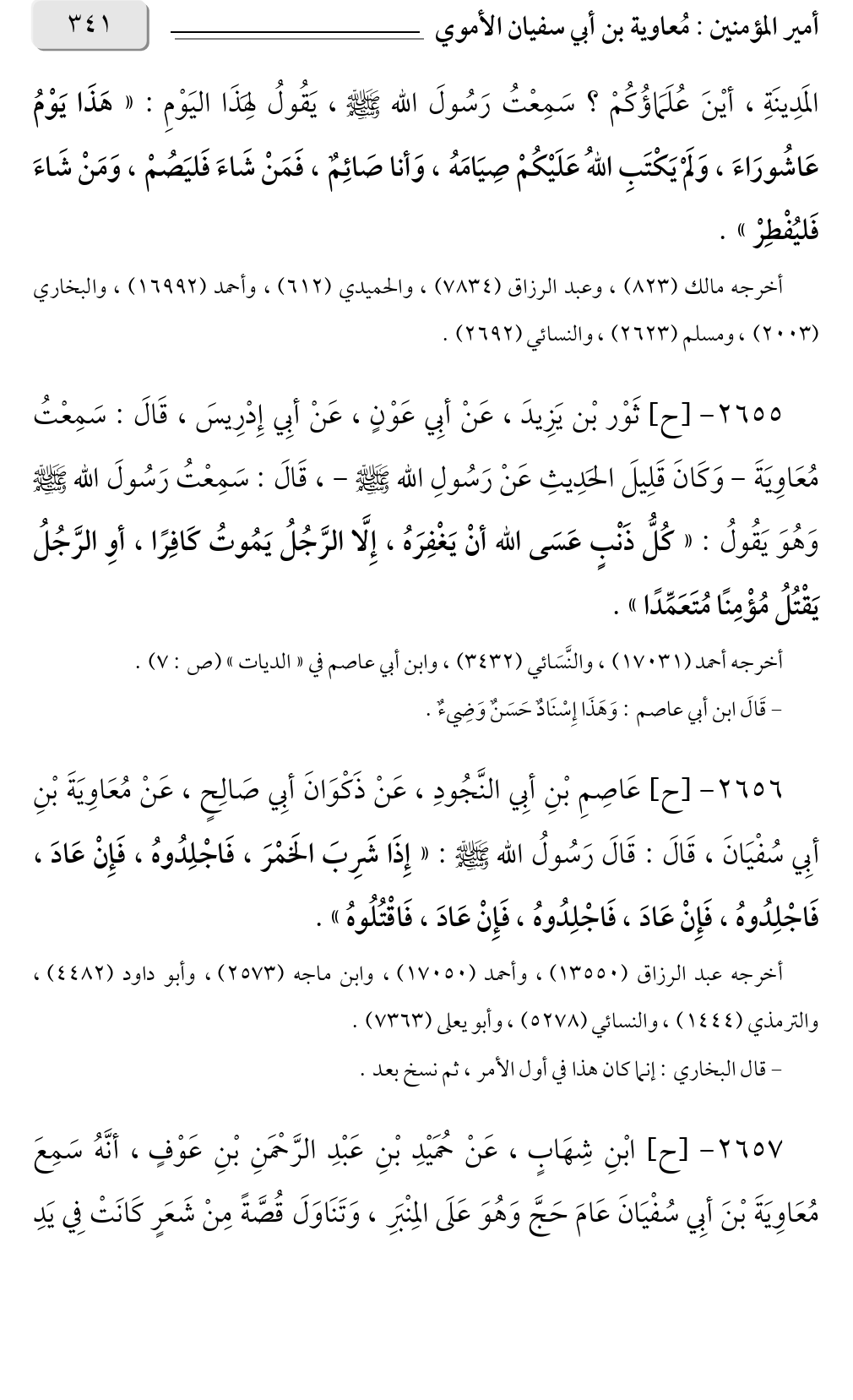 ٢٦٥٥ - [ح] ثَوْر بْن يَزِيدَ، عَنْ أبِي عَوْنٍ، عَنْ أبِي إِدْرِيسَ، قَالَ: سَمِعْتُ مُعَاوِيَةَ - وَكَانَ قَلِيلَ الحَدِيثِ عَنْ رَسُولِ الله صلى الله عليه وسلم -، قَالَ: سَمِعْتُ رَسُولَ الله صلى الله عليه وسلم وَهُوَ يَقُولُ: «كُلُّ ذَنْبٍ عَسَى الله أنْ يَغْفِرَهُ، إِلَّا الرَّجُلُ يَمُوتُ كَافِرًا، أوِ الرَّجُلُ يَقْتُلُ مُؤْمِنًا مُتَعَمِّدًا».