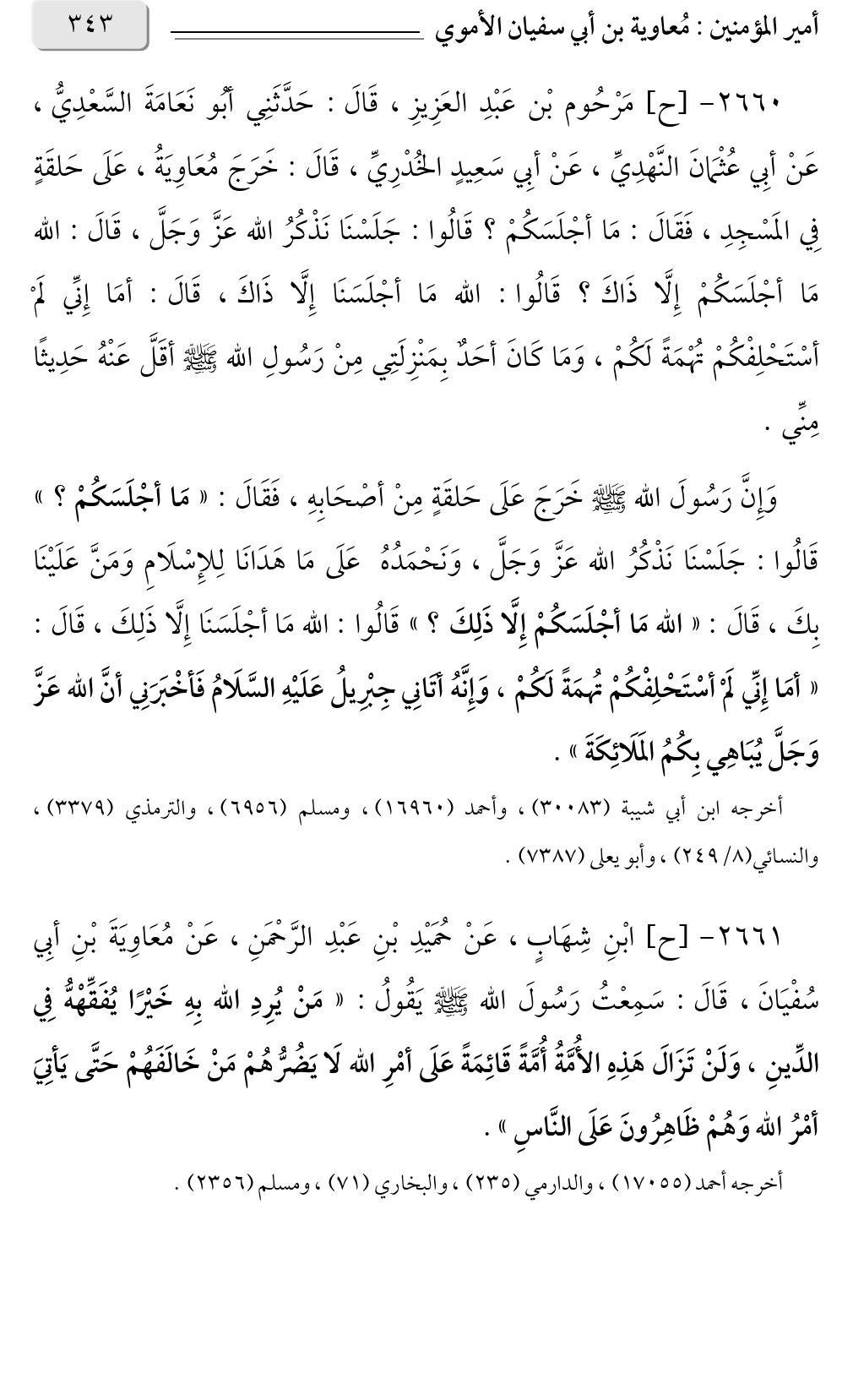 ٢٦٦٠ - [ح] مَرْحُوم بْن عَبْدِ العَزِيزِ، قَالَ: حَدَّثَنِي أبُو نَعَامَةَ السَّعْدِيُّ، عَنْ أبِي عُثْمَانَ النَّهْدِيِّ، عَنْ أبِي سَعِيدٍ الخُدْرِيِّ، قَالَ: خَرَجَ مُعَاوِيَةُ، عَلَى حَلقَةٍ فِي المَسْجِدِ، فَقَالَ: مَا أجْلَسَكُمْ؟ قَالُوا: جَلَسْنَا نَذْكُرُ الله عَزَّ وَجَلَّ، قَالَ: الله مَا أجْلَسَكُمْ إِلَّا ذَاكَ؟ قَالُوا: الله مَا أجْلَسَنَا إِلَّا ذَاكَ، قَالَ: أمَا إِنِّي لَمْ أسْتَحْلِفْكُمْ تُهْمَةً لَكُمْ، وَمَا كَانَ أحَدٌ بِمَنْزِلَتِي مِنْ رَسُولِ الله صلى الله عليه وسلم أقَلَّ عَنْهُ حَدِيثًا مِنِّي.