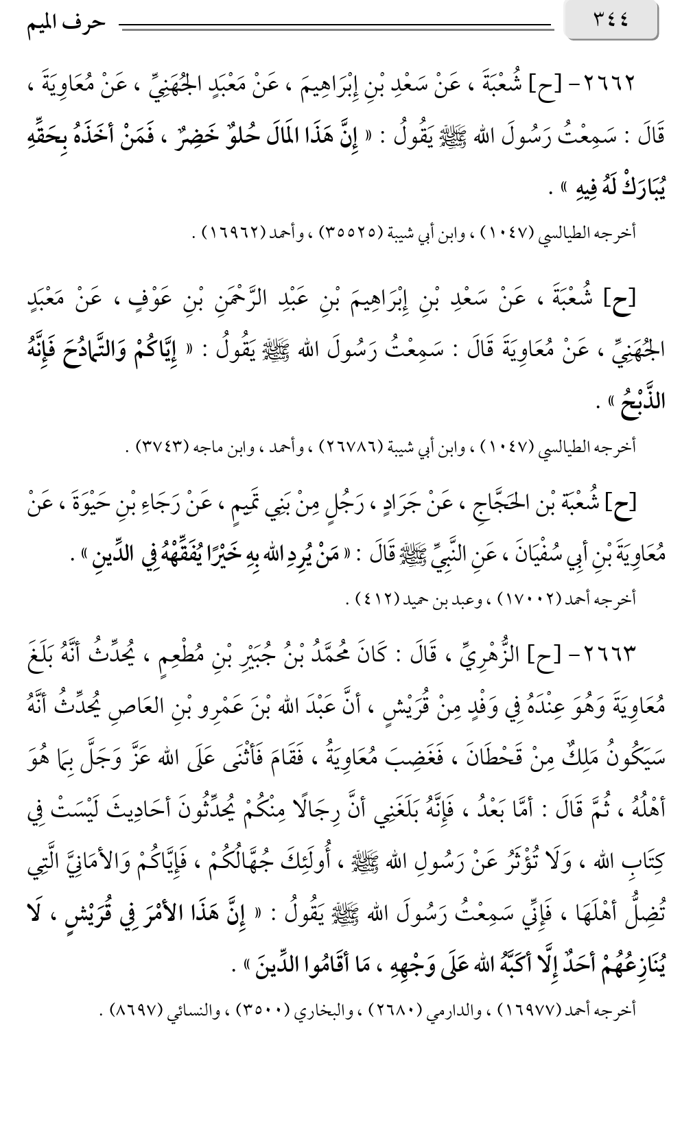 ٢٦٦٢ - [ح] شُعْبَةَ، عَنْ سَعْدِ بْنِ إِبْرَاهِيمَ، عَنْ مَعْبَدٍ الجُهَنِيِّ، عَنْ مُعَاوِيَةَ، قَالَ: سَمِعْتُ رَسُولَ الله صلى الله عليه وسلم يَقُولُ: «إِنَّ هَذَا المَالَ حُلوٌ خَضِرٌ، فَمَنْ أخَذَهُ بِحَقِّهِ يُبَارَكْ لَهُ فِيهِ».