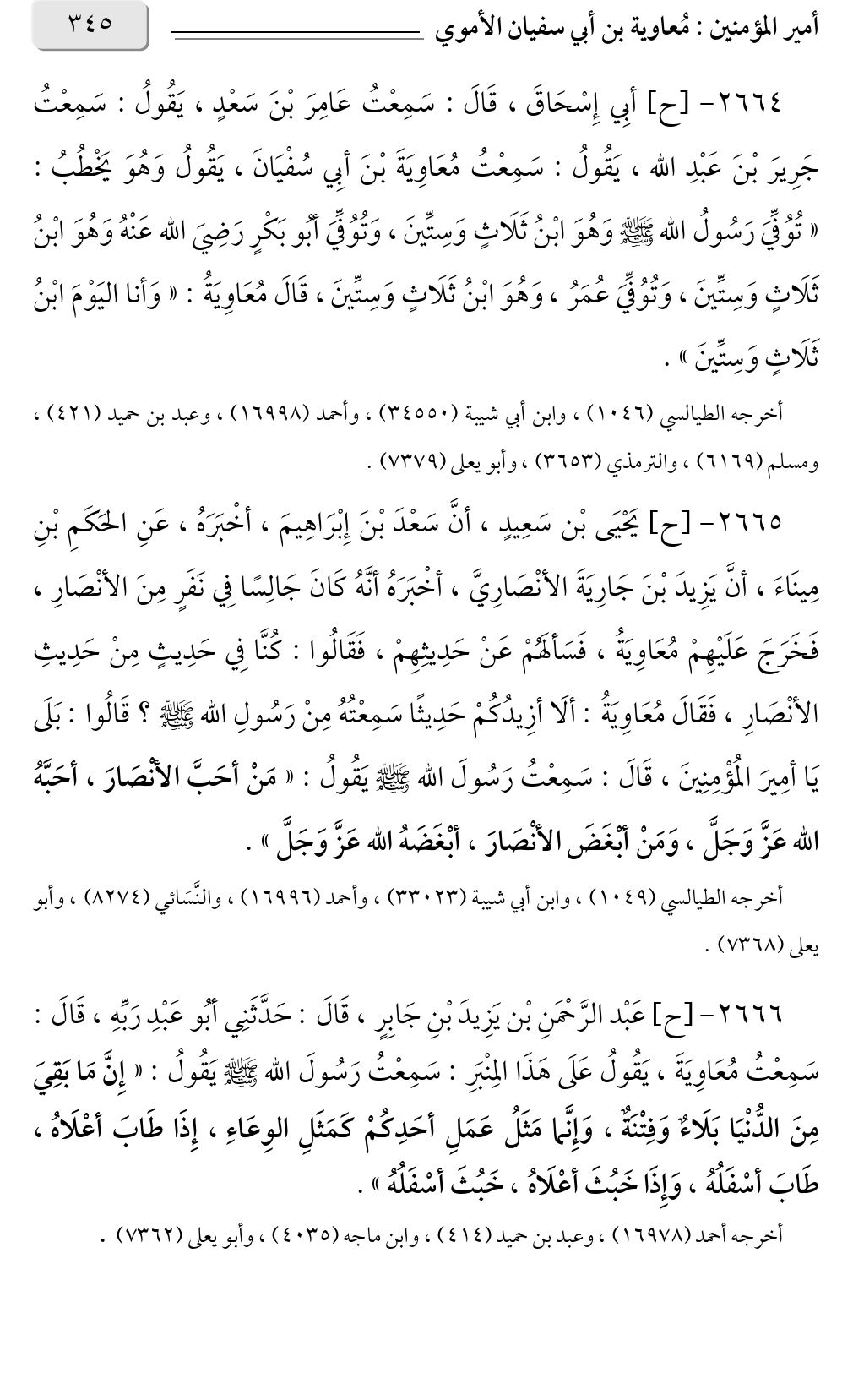 أخرجه الطيالسي (١٠٤٦)، وابن أبي شيبة (٣٤٥٥٠)، وأحمد (١٦٩٩٨)، وعبد بن حميد (٤٢١)، ومسلم (٦١٦٩)، والترمذي (٣٦٥٣)، وأبو يعلى (٧٣٧٩).