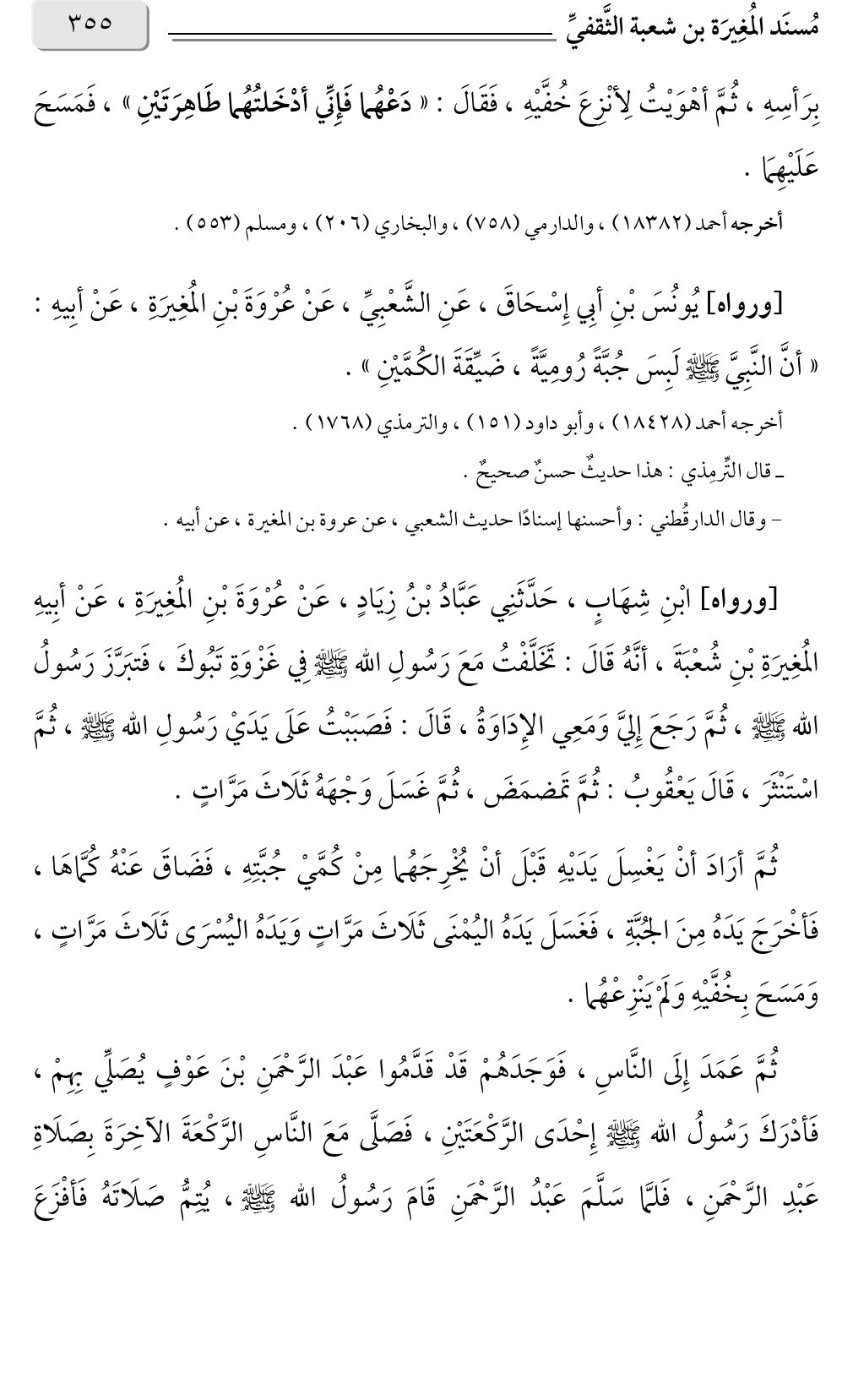 [ورواه] يُونُسَ بْنِ أبِي إِسْحَاقَ، عَنِ الشَّعْبِيِّ، عَنْ عُرْوَةَ بْنِ المُغِيرَةِ، عَنْ أبِيهِ: «أنَّ النَّبِيَّ صلى الله عليه وسلم لَبِسَ جُبَّةً رُومِيَّةً، ضَيِّقَةَ الكُمَّيْنِ».