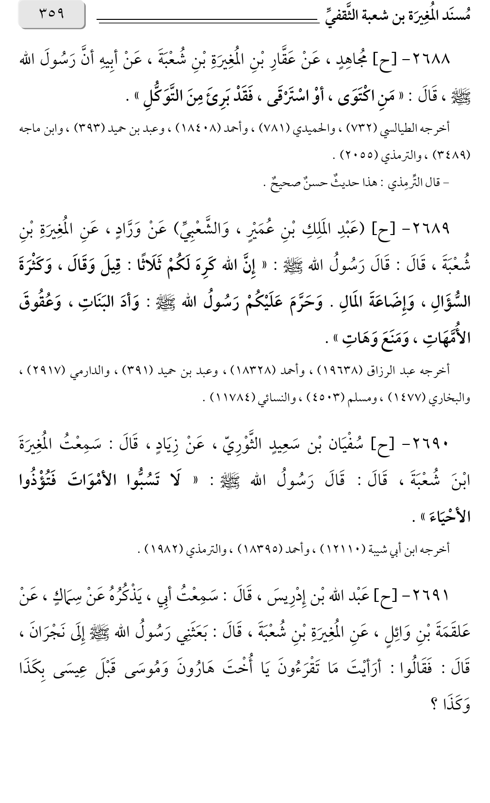 ٢٦٨٩ - [ح] (عَبْدِ المَلِكِ بْنِ عُمَيْرٍ، وَالشَّعْبِيِّ) عَنْ وَرَّادٍ، عَنِ المُغِيرَةِ بْنِ شُعْبَةَ، قَالَ: قَالَ رَسُولُ الله صلى الله عليه وسلم: «إِنَّ الله كَرِهَ لَكُمْ ثَلَاثًا: قِيلَ وَقَالَ، وَكَثْرَةَ السُّؤَالِ، وَإِضَاعَةَ المَالِ. وَحَرَّمَ عَلَيْكُمْ رَسُولُ الله صلى الله عليه وسلم: وَأدَ البَنَاتِ، وَعُقُوقَ الأُمَّهَاتِ، وَمَنَعَ وَهَاتِ».