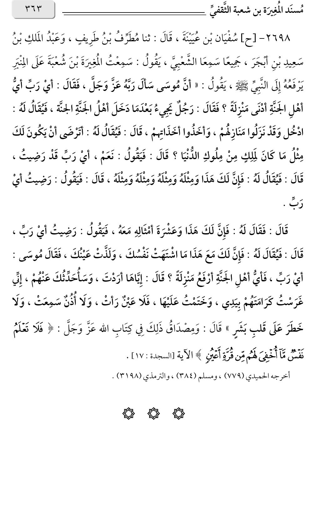 ٢٦٩٨ - [ح] سُفْيَان بْن عُيَيْنَةَ، قَالَ: ثنا مُطَرِّفُ بْنُ طَرِيفٍ، وَعَبْدُ المَلكِ بْنُ سَعِيدِ بْنِ أبْجَرَ، جَمِيعًا سَمِعَا الشَّعْبِيَّ، يَقُولُ: سَمِعْتُ المُغِيرَةَ بْنَ شُعْبَةَ عَلَى المِنْبَرِ يَرْفَعُهُ إِلَى النَّبِيِّ صلى الله عليه وسلم، يَقُولُ: «أنَّ مُوسَى سَألَ رَبَّهُ عَزَّ وَجَلَّ، فَقَالَ: أيْ رَبِّ أيُّ أهْلِ الجَنَّةِ أدْنَى مَنْزِلَةً؟ فَقَالَ: رَجُلٌ يَجِيءُ بَعْدَمَا دَخَلَ أهْلُ الجَنَّةِ الجنَّة، فَيُقَالُ لَهُ: ادْخُل وَقَدْ نَزَلُوا مَنَازِلهُمْ، وَأخَذُوا أخَذَاتِهمْ، قَالَ: فَيُقَالُ لَهُ: أتَرْضَى أنْ يَكُونَ لَكَ مِثْلُ مَا كَانَ لمَلِكٍ مِنْ مِلُوكِ الدُّنْيَا؟ قَالَ: فَيَقُولُ: نَعَمْ، أيْ رَبِّ قَدْ رَضِيتُ، قَالَ: فَيُقَالُ لَهُ: فَإِنَّ لَكَ هَذَا وَمِثْلَهُ وَمِثْلَهُ وَمِثْلَهُ وَمِثْلَهُ، قَالَ: فَيَقُولُ: رَضِيتُ أيْ رَبِّ.