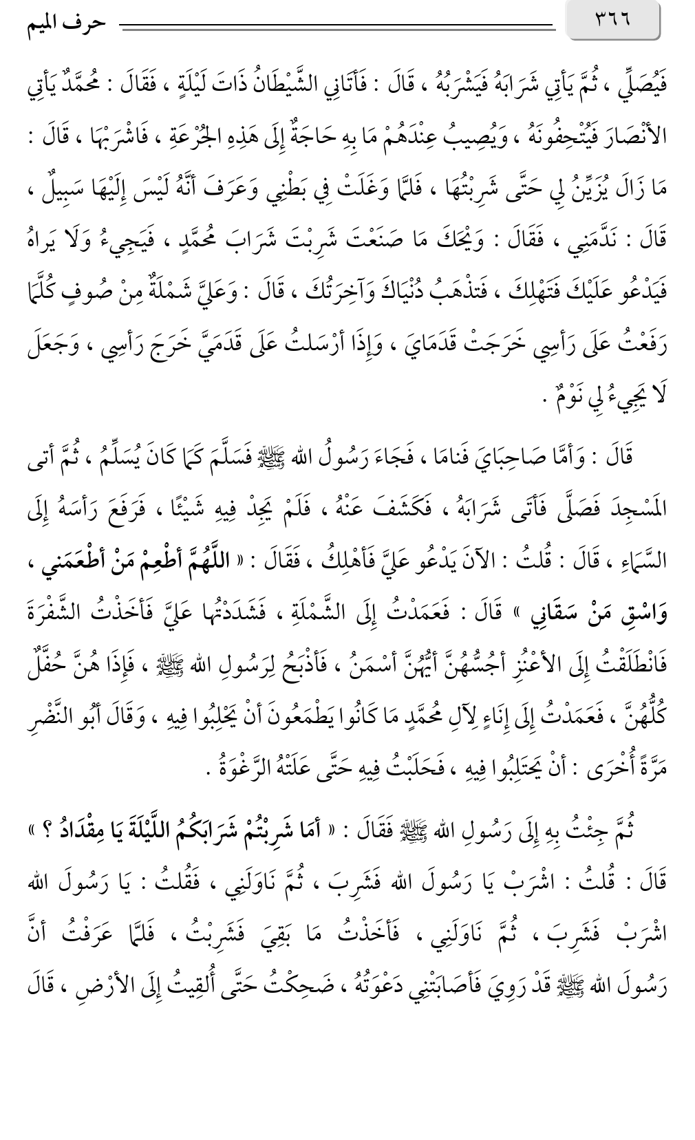 ثُمَّ جِئْتُ بِهِ إِلَى رَسُولِ الله صلى الله عليه وسلم فَقَالَ: «أمَا شَرِبْتُمْ شَرَابَكُمُ اللَّيْلَةَ يَا مِقْدَادُ؟ » قَالَ: قُلتُ: اشْرَبْ يَا رَسُولَ الله فَشَرِبَ، ثُمَّ نَاوَلَنِي، فَقُلتُ: يَا رَسُولَ الله اشْرَبْ فَشَرِبَ، ثُمَّ نَاوَلَنِي، فَأخَذْتُ مَا بَقِيَ فَشَرِبْتُ، فَلمَّا عَرَفْتُ أنَّ رَسُولَ الله صلى الله عليه وسلم قَدْ رَوِيَ فَأصَابَتْنِي دَعْوَتُهُ، ضَحِكْتُ حَتَّى أُلقِيتُ إِلَى الأرْضِ، قَالَ