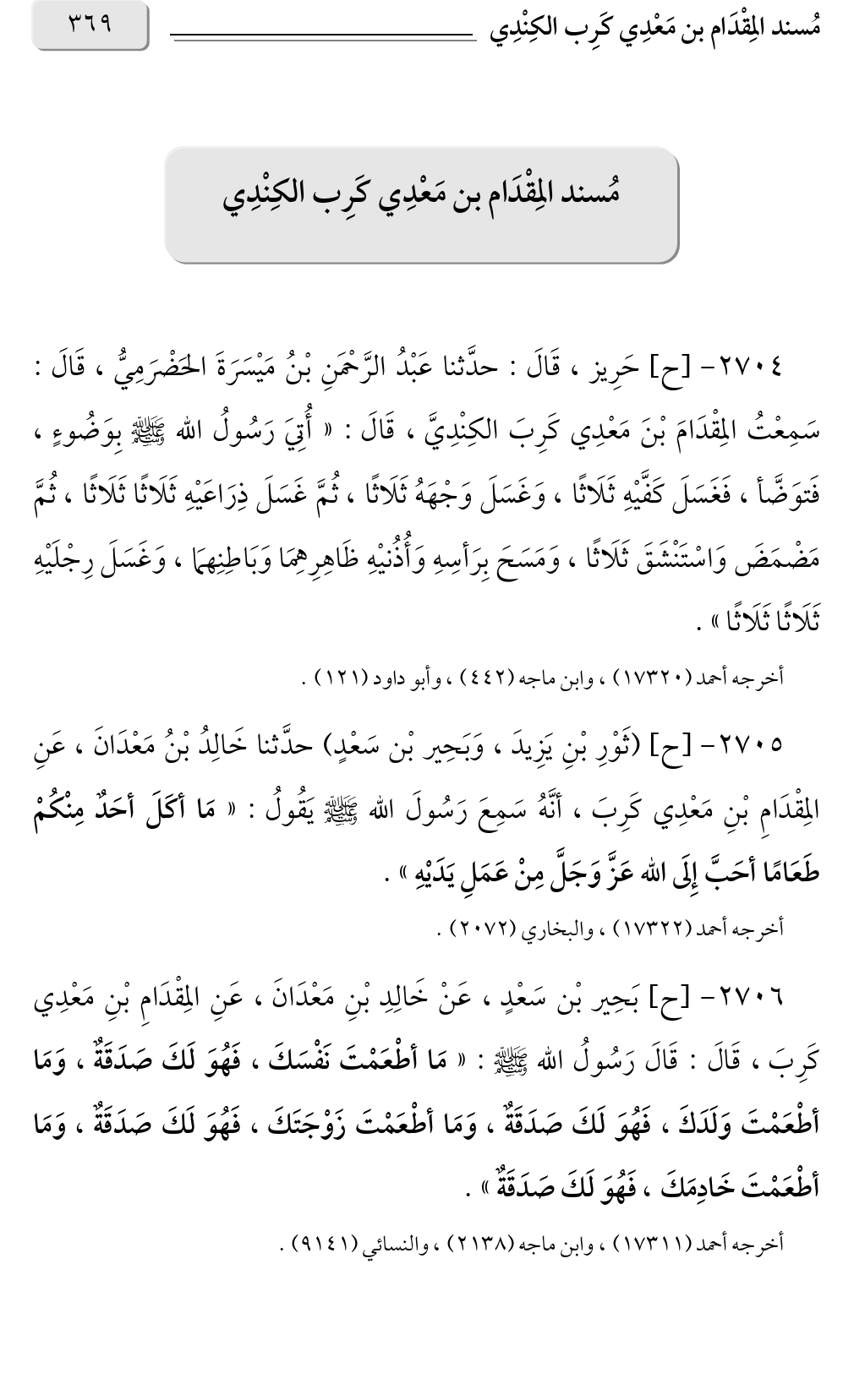 ٢٧٠٤ - [ح] حَرِيز، قَالَ: حدَّثنا عَبْدُ الرَّحْمَنِ بْنُ مَيْسَرَةَ الحَضْرَمِيُّ، قَالَ: سَمِعْتُ المِقْدَامَ بْنَ مَعْدِي كَرِبَ الكِنْدِيَّ، قَالَ: «أُتِيَ رَسُولُ الله صلى الله عليه وسلم بِوَضُوءٍ، فَتوَضَّأ، فَغَسَلَ كَفَّيْهِ ثَلَاثًا، وَغَسَلَ وَجْهَهُ ثَلَاثًا، ثُمَّ غَسَلَ ذِرَاعَيْهِ ثَلَاثًا ثَلَاثًا، ثُمَّ مَضْمَضَ وَاسْتَنْشَقَ ثَلَاثًا، وَمَسَحَ بِرَأسِهِ وَأُذُنيْهِ ظَاهِرِهِمَا وَبَاطِنِهمَا، وَغَسَلَ رِجْلَيْهِ ثَلَاثًا ثَلَاثًا».