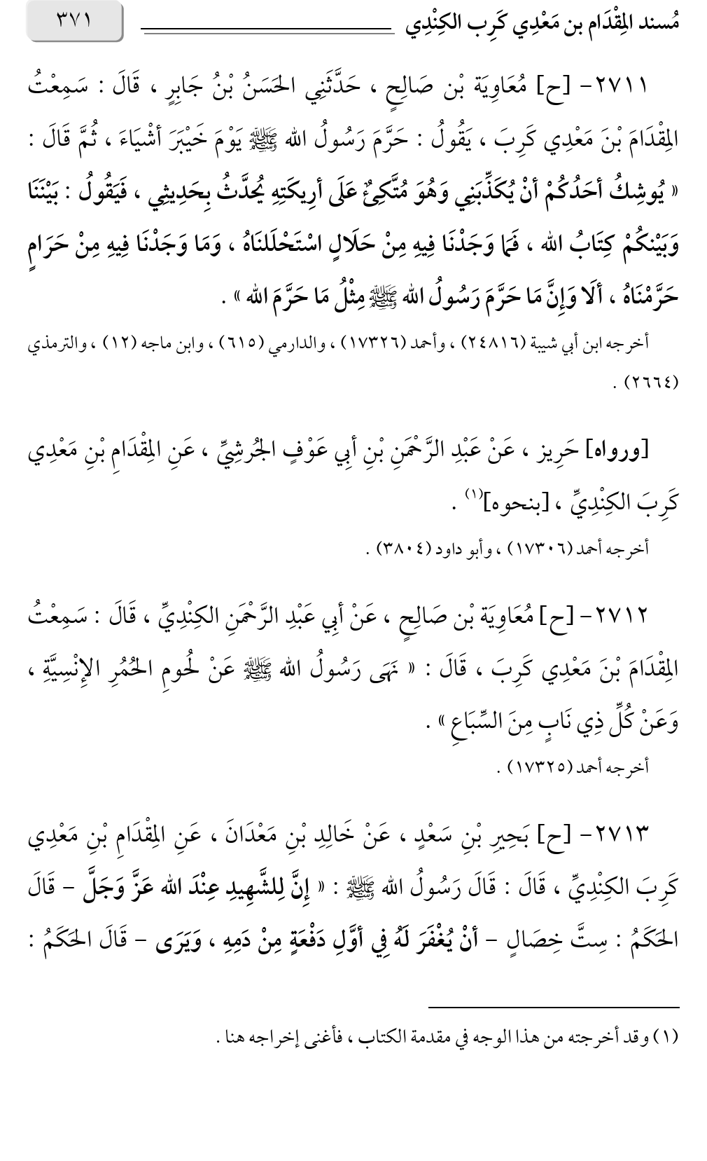 ٢٧١١ - [ح] مُعَاوِيَة بْن صَالِحٍ، حَدَّثَنِي الحَسَنُ بْنُ جَابِرٍ، قَالَ: سَمِعْتُ المِقْدَامَ بْنَ مَعْدِي كَرِبَ، يَقُولُ: حَرَّمَ رَسُولُ الله صلى الله عليه وسلم يَوْمَ خَيْبَرَ أشْيَاءَ، ثُمَّ قَالَ: «يُوشِكُ أحَدُكُمْ أنْ يُكَذِّبَنِي وَهُوَ مُتَّكِئٌ عَلَى أرِيكَتِهِ يُحدَّثُ بِحَدِيثِي، فَيَقُولُ: بَيْنَنَا وَبَيْنكُمْ كِتَابُ الله، فَمَا وَجَدْنَا فِيهِ مِنْ حَلَالٍ اسْتَحْلَلنَاهُ، وَمَا وَجَدْنَا فِيهِ مِنْ حَرَامٍ حَرَّمْنَاهُ، ألَا وَإِنَّ مَا حَرَّمَ رَسُولُ الله صلى الله عليه وسلم مِثْلُ مَا حَرَّمَ الله».