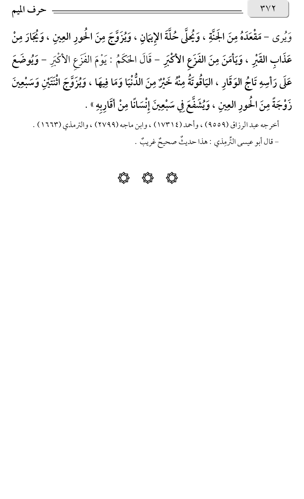 وَيُرى - مَقْعَدَهُ مِنَ الجَنَّةِ، وَيُحلَّى حُلَّةَ الإِيمَانِ، وَيُزَوَّجَ مِنَ الحُورِ العِينِ، وَيُجَارَ مِنْ عَذَابِ القَبْرِ، وَيَأمَنَ مِنَ الفَزَعِ الأكْبَرِ - قَالَ الحَكَمُ: يَوْمَ الفَزَعِ الأكْبَرِ - وَيُوضَعَ عَلَى رَأسِهِ تَاجُ الوَقَارِ، اليَاقُوتَةُ مِنْهُ خَيْرٌ مِنَ الدُّنْيَا وَمَا فِيهَا، وَيُزَوَّجَ اثْنَتَيْنِ وَسَبْعِينَ زَوْجَةً مِنَ الحُورِ العِينِ، وَيُشَفَّعَ فِي سَبْعِينَ إِنْسَانًا مِنْ أقَارِبِهِ».