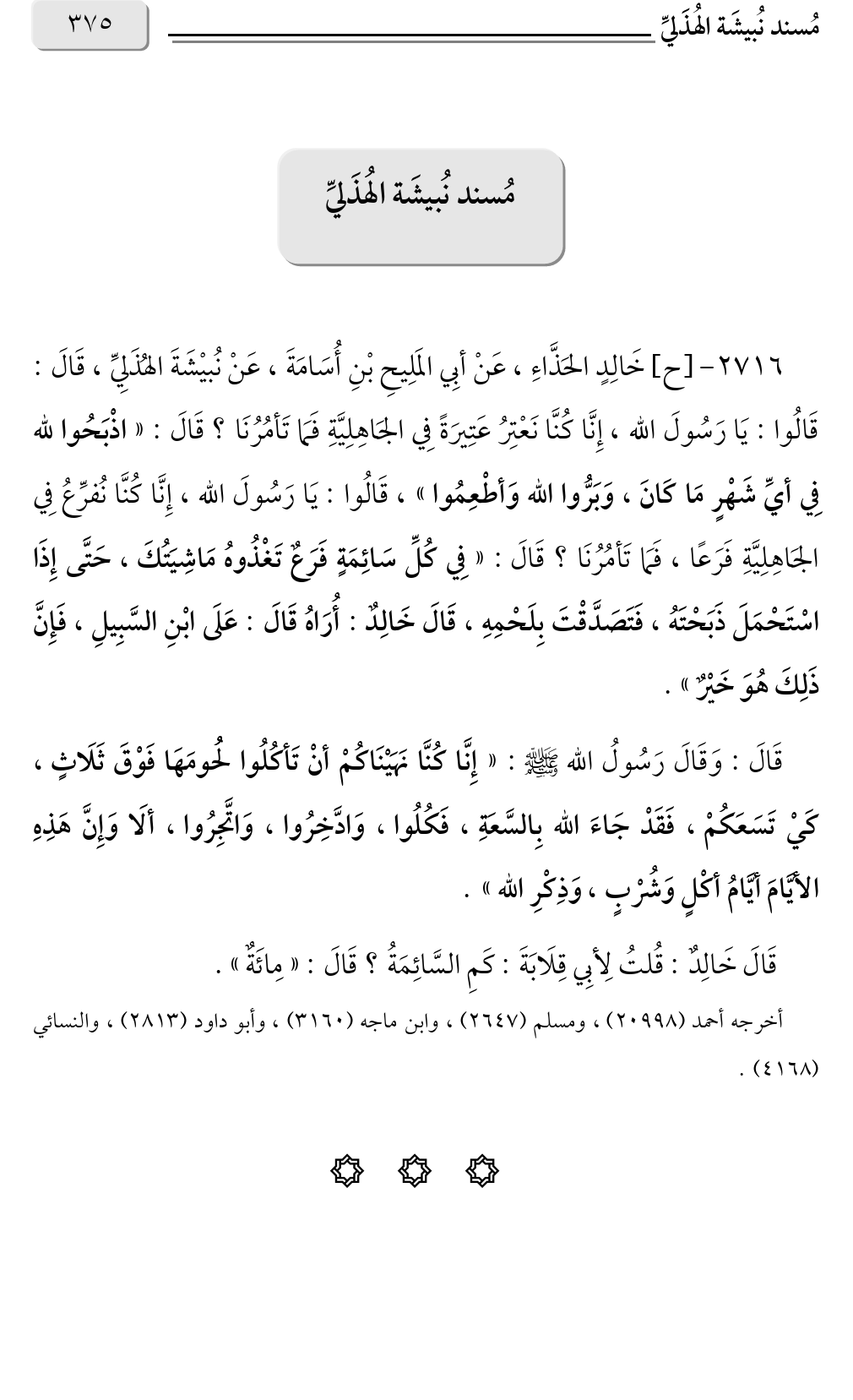 ٢٧١٦ - [ح] خَالِدٍ الحَذَّاءِ، عَنْ أبِي المَلِيحِ بْنِ أُسَامَةَ، عَنْ نُبيْشَةَ الهُذَلِيِّ، قَالَ: قَالُوا: يَا رَسُولَ الله، إِنَّا كُنَّا نَعْتِرُ عَتِيرَةً فِي الجَاهِلِيَّةِ فَمَا تَأمُرُنَا؟ قَالَ: «اذْبَحُوا لله فِي أيِّ شَهْرٍ مَا كَانَ، وَبَرُّوا الله وَأطْعِمُوا» قَالُوا: يَا رَسُولَ الله، إِنَّا كُنَّا نُفرِّعُ فِي، الجَاهِلِيَّةِ فَرَعًا، فَمَا تَأمُرُنَا؟ قَالَ: «فِي كُلِّ سَائِمَةٍ فَرَعٌ تَغْذُوهُ مَاشِيَتُكَ، حَتَّى إِذَا اسْتَحْمَلَ ذَبَحْتَهُ، فَتَصَدَّقْتَ بِلَحْمِهِ، قَالَ خَالِدٌ: أُرَاهُ قَالَ: عَلَى ابْنِ السَّبِيلِ، فَإِنَّ ذَلِكَ هُوَ خَيْرٌ».