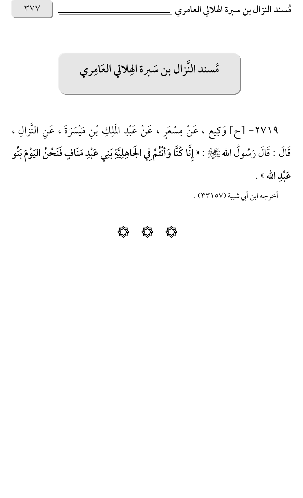 ٢٧١٩ - [ح] وَكِيع، عَنْ مِسْعَرٍ، عَنْ عَبْدِ المَلِكِ بْنِ مَيْسَرَةَ، عَنِ النَّزالِ، قَالَ: قَالَ رَسُولُ الله صلى الله عليه وسلم: «إِنَّا كُنَّا وَأنْتُمْ فِي الجَاهِلِيَّةِ بَنِي عَبْدِ مَنَافٍ فَنَحْنُ اليَوْمَ بَنُو عَبْدِ الله».