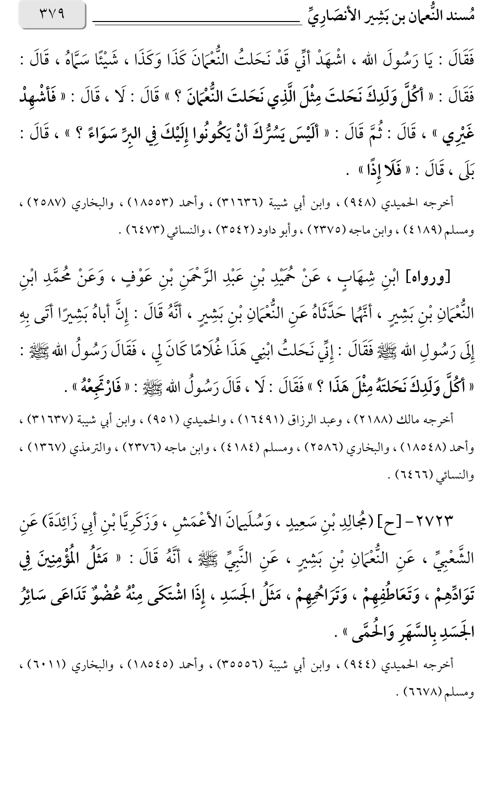 ٢٧٢٣ - [ح] (مُجالِدِ بْنِ سَعِيدٍ، وَسُلَيمانَ الأعْمَشِ، وَزَكَرِيَّا بْنِ أبِي زَائِدَةَ) عَنِ الشَّعْبِيِّ، عَنِ النُّعْمَانِ بْنِ بَشِيرٍ، عَنِ النَّبِيِّ صلى الله عليه وسلم، أنَّهُ قَالَ: «مَثَلُ المُؤْمِنِينَ فِي تَوَادِّهِمْ، وَتَعَاطُفِهِمْ، وَتَرَاحُمِهِمْ، مَثَلُ الجَسَدِ، إِذَا اشْتَكَى مِنْهُ عُضْوٌ تَدَاعَى سَائِرُ الجَسَدِ بِالسَّهَرِ وَالحُمَّى».