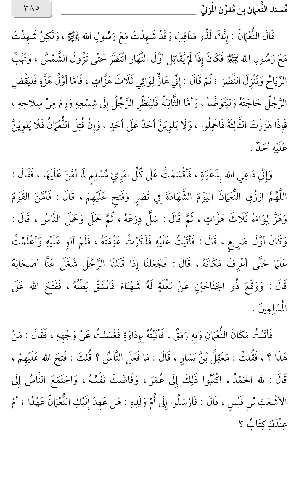 وَإِنِّي دَاعِي الله بِدَعْوَةٍ، فَأقْسَمْتُ عَلَى كُلِّ امْرِئٍ مُسْلِمٍ لمَا أمَّنَ عَلَيْهَا، فَقَالَ: اللَّهُمَّ ارْزُقِ النُّعْمَانَ اليَوْمَ الشَّهَادَةَ فِي نَصْرٍ وَفَتْحٍ عَلَيْهِمْ، قَالَ: فَأمَّنَ القَوْمُ وَهَزَّ لِوَاءَهُ ثَلَاثَ هَزَّاتٍ، ثُمَّ قَالَ: سَلَّ دِرْعَهُ، ثُمَّ حَمَلَ وَحَمَلَ النَّاسُ، قَالَ: وَكَانَ أوَّلَ صَرِيعٍ، قَالَ: فَأتَيْتُ عَلَيْهِ فَذَكَرْتُ عَزْمَتَهُ، فَلَمْ ألوِ عَلَيْهِ وَأعْلَمْتُ عَلَمًا حَتَّى أعْرِفَ مَكَانَهُ، قَالَ: فَجَعَلنَا إِذَا قَتَلنَا الرَّجُلَ شَغَلَ عَنَّا أصْحَابَهُ قَالَ: وَوَقَعَ ذُو الجَنَاحَيْنِ عَنْ بَغْلَةٍ لَهُ شَهْبَاءَ فَانْشَقَّ بَطْنُهُ، فَفَتَحَ الله عَلَى المُسْلِمِينَ. فَأتَيْتُ مَكَانَ النُّعْمَانِ وَبِهِ رَمَقٌ، فَأتَيْتُهُ بِإِدَاوَةٍ فَغَسَلتُ عَنْ وَجْهِهِ، فَقَالَ: مَنْ هَذَا؟ ، فَقُلتُ: مَعْقِلُ بْنُ يَسَارٍ، قَالَ: مَا فَعَلَ النَّاسُ؟ قُلتُ: فَتحَ الله عَلَيْهِمْ، قَالَ: لله الحَمْدُ، اكْتُبُوا ذَلِكَ إِلَى عُمَرَ، وَفَاضَتْ نَفْسُهُ، وَاجْتَمَعَ النَّاسُ إِلَى الأشْعَثِ بْنِ قَيْسٍ، قَالَ: فَأرْسَلُوا إِلَى أُمِّ وَلَدِهِ: هَل عَهِدَ إِلَيْكِ النُّعْمَانُ عَهْدًا؛ أمْ عِنْدَكِ كِتَابٌ؟