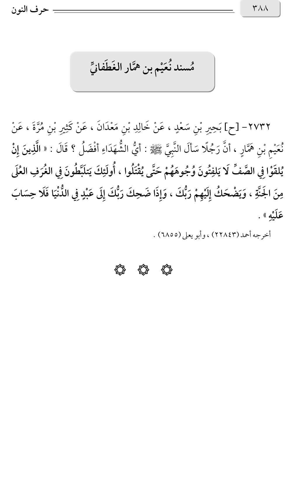 ٢٧٣٢ - [ح] بَحِيرِ بْنِ سَعْدٍ، عَنْ خَالِدِ بْنِ مَعْدَانَ، عَنْ كَثِيرِ بْنِ مُرَّةَ، عَنْ نُعَيْمِ بْنِ هَمَّارٍ، أنَّ رَجُلًا سَألَ النَّبِيَّ صلى الله عليه وسلم: أيُّ الشُّهَدَاءِ أفْضَلُ؟ قَالَ: «الَّذِينَ إِنْ يُلقَوْا فِي الصَّفِّ لَا يَلفِتُونَ وُجُوهَهُمْ حَتَّى يُقْتَلُوا، أُولَئِكَ يَتلَبَّطُونَ فِي الغُرَفِ العُلَى مِنَ الجَنَّةِ، وَيَضْحَكُ إِلَيْهِمْ رَبُّكَ، وَإِذَا ضَحِكَ رَبُّكَ إِلَى عَبْدٍ فِي الدُّنْيَا فَلَا حِسَابَ عَلَيْهِ».