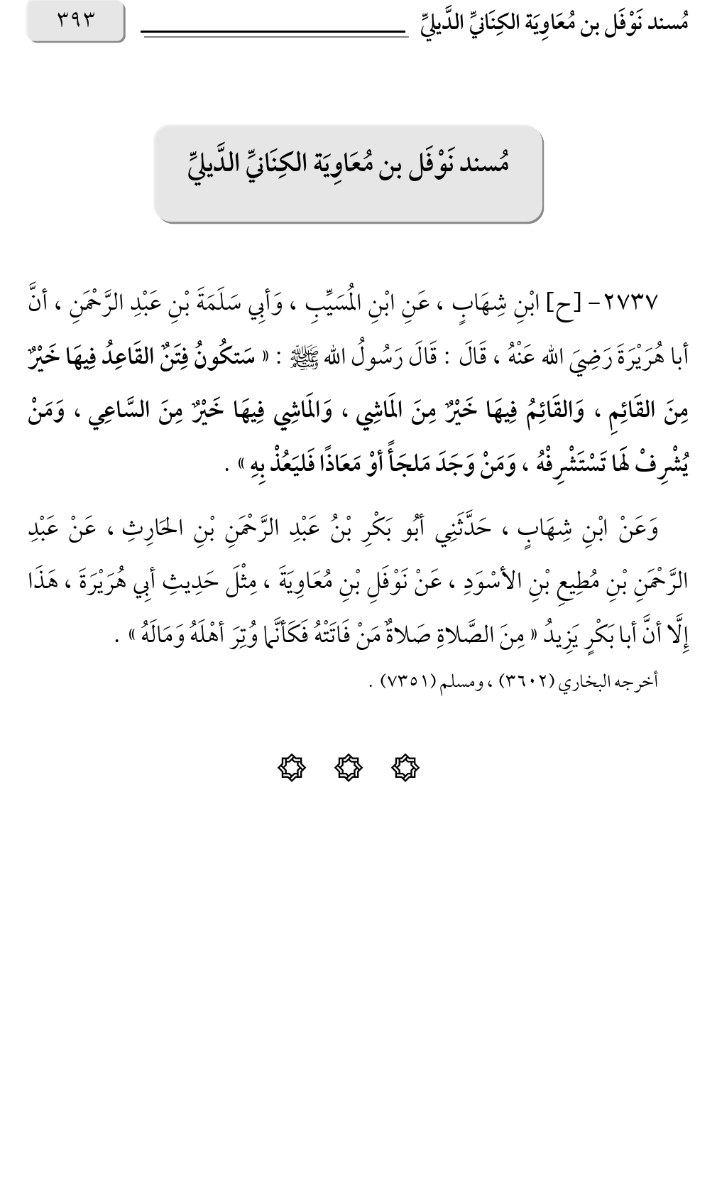 ٢٧٣٧ - [ح] ابْنِ شِهَابٍ، عَنِ ابْنِ المُسَيِّبِ، وَأبِي سَلَمَةَ بْنِ عَبْدِ الرَّحْمَنِ، أنَّ أبا هُرَيْرَةَ رَضِيَ الله عَنْهُ، قَالَ: قَالَ رَسُولُ الله صلى الله عليه وسلم: «سَتكُونُ فِتَنٌ القَاعِدُ فِيهَا خَيْرٌ مِنَ القَائِمِ، وَالقَائِمُ فِيهَا خَيْرٌ مِنَ المَاشِي، وَالمَاشِي فِيهَا خَيْرٌ مِنَ السَّاعِي، وَمَنْ يُشْرِفْ لهَا تَسْتَشْرِفْهُ، وَمَنْ وَجَدَ مَلجَأً أوْ مَعَاذًا فَليَعُذْ بِهِ».