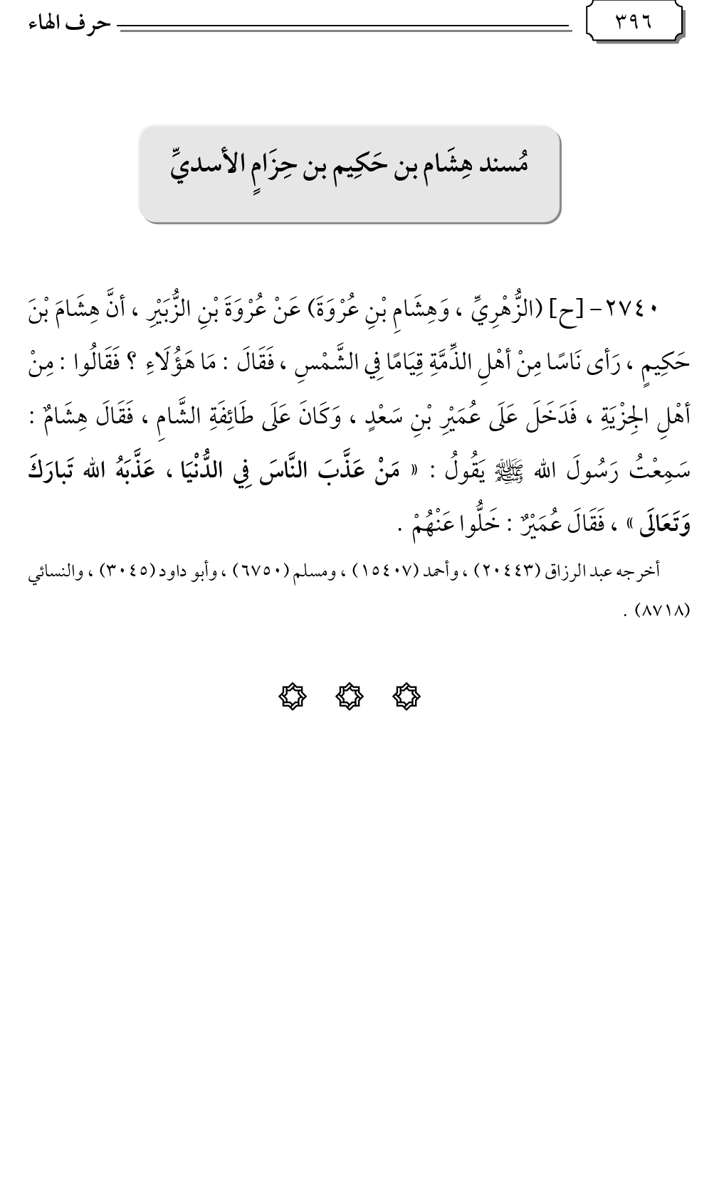 ٢٧٤٠ - [ح] (الزُّهْرِيِّ، وَهِشَامِ بْنِ عُرْوَةَ) عَنْ عُرْوَةَ بْنِ الزُّبَيْرِ، أنَّ هِشَامَ بْنَ حَكِيمٍ، رَأى نَاسًا مِنْ أهْلِ الذِّمَّةِ قِيَامًا فِي الشَّمْسِ، فَقَالَ: مَا هَؤُلَاءِ؟ فَقَالُوا: مِنْ أهْلِ الجِزْيَةِ، فَدَخَلَ عَلَى عُمَيْرِ بْنِ سَعْدٍ، وَكَانَ عَلَى طَائِفَةِ الشَّامِ، فَقَالَ هِشَامٌ: سَمِعْتُ رَسُولَ الله صلى الله عليه وسلم يَقُولُ: «مَنْ عَذَّبَ النَّاسَ فِي الدُّنْيَا، عَذَّبَهُ الله تَبارَكَ وَتَعَالَى» فَقَالَ عُمَيْرٌ: خَلُّوا عَنْهُمْ.