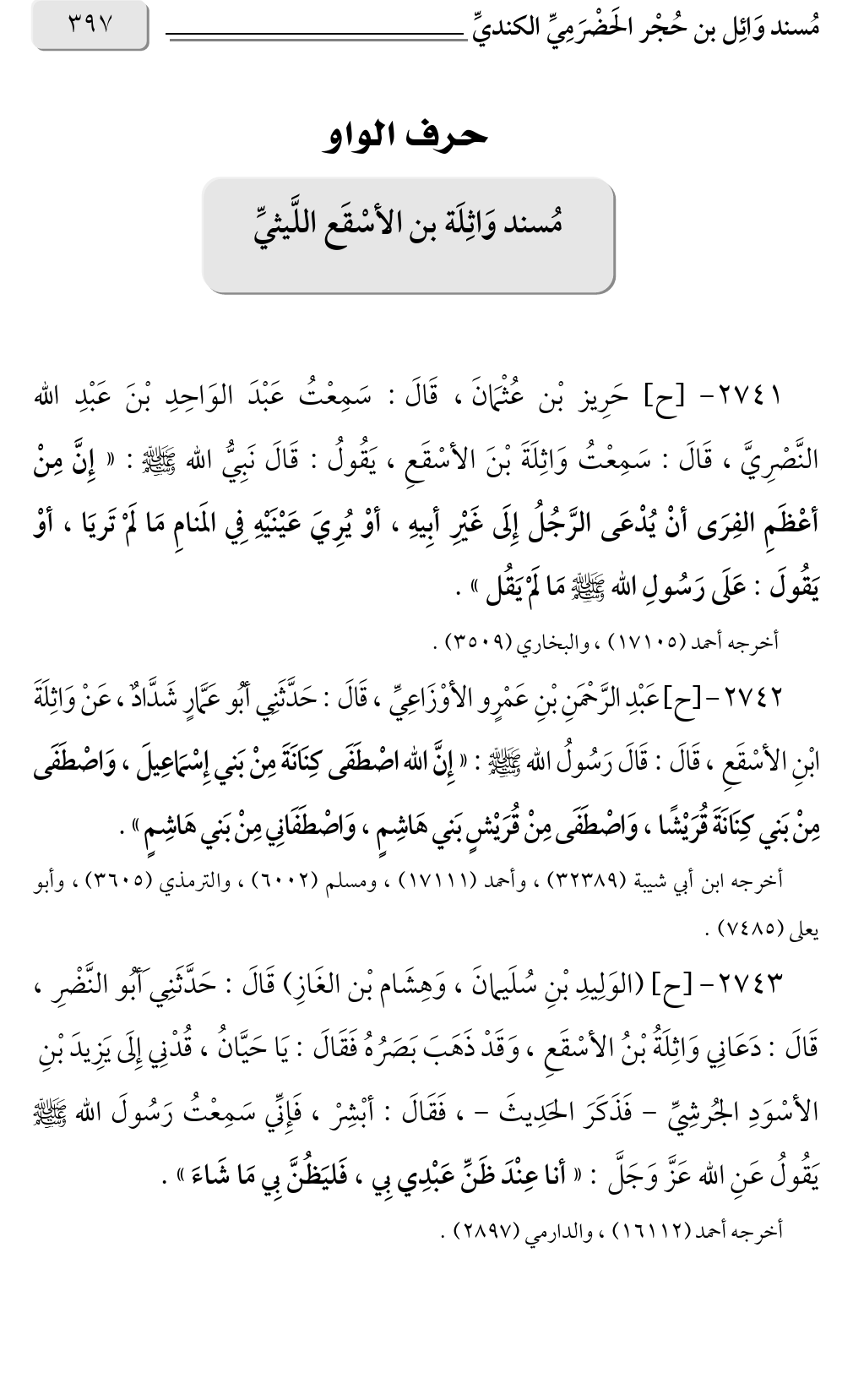 ٢٧٤٢ - [ح] عَبْدِ الرَّحْمَنِ بْنِ عَمْرٍو الأوْزَاعِيِّ، قَالَ: حَدَّثَنِي أبُو عَمَّارٍ شَدَّادٌ، عَنْ وَاثِلَةَ ابْنِ الأسْقَعِ، قَالَ: قَالَ رَسُولُ الله صلى الله عليه وسلم: «إِنَّ الله اصْطَفَى كِنَانَةَ مِنْ بَني إِسْمَاعِيلَ، وَاصْطَفَى مِنْ بَني كِنَانَةَ قُرَيْشًا، وَاصْطَفَى مِنْ قُرَيْشٍ بَني هَاشِمٍ، وَاصْطَفَانِي مِنْ بَني هَاشِمٍ».