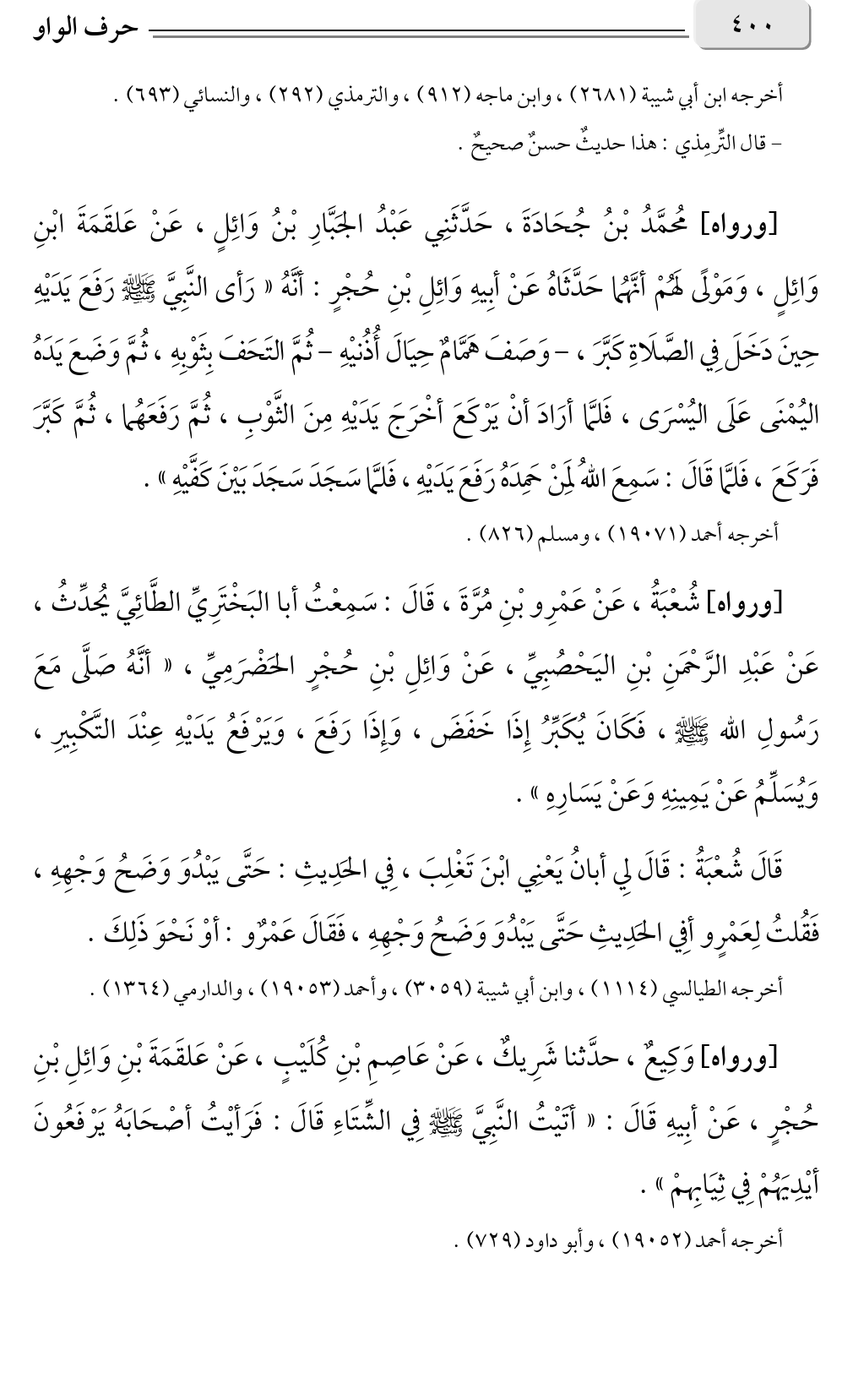 [ورواه] وَكِيعٌ، حدَّثنا شَرِيكٌ، عَنْ عَاصِمِ بْنِ كُلَيْبٍ، عَنْ عَلقَمَةَ بْنِ وَائِلِ بْنِ حُجْرٍ، عَنْ أبِيهِ قَالَ: «أتَيْتُ النَّبِيَّ صلى الله عليه وسلم فِي الشِّتَاءِ قَالَ: فَرَأيْتُ أصْحَابَهُ يَرْفَعُونَ أيْدِيَهُمْ فِي ثِيَابِهمْ».