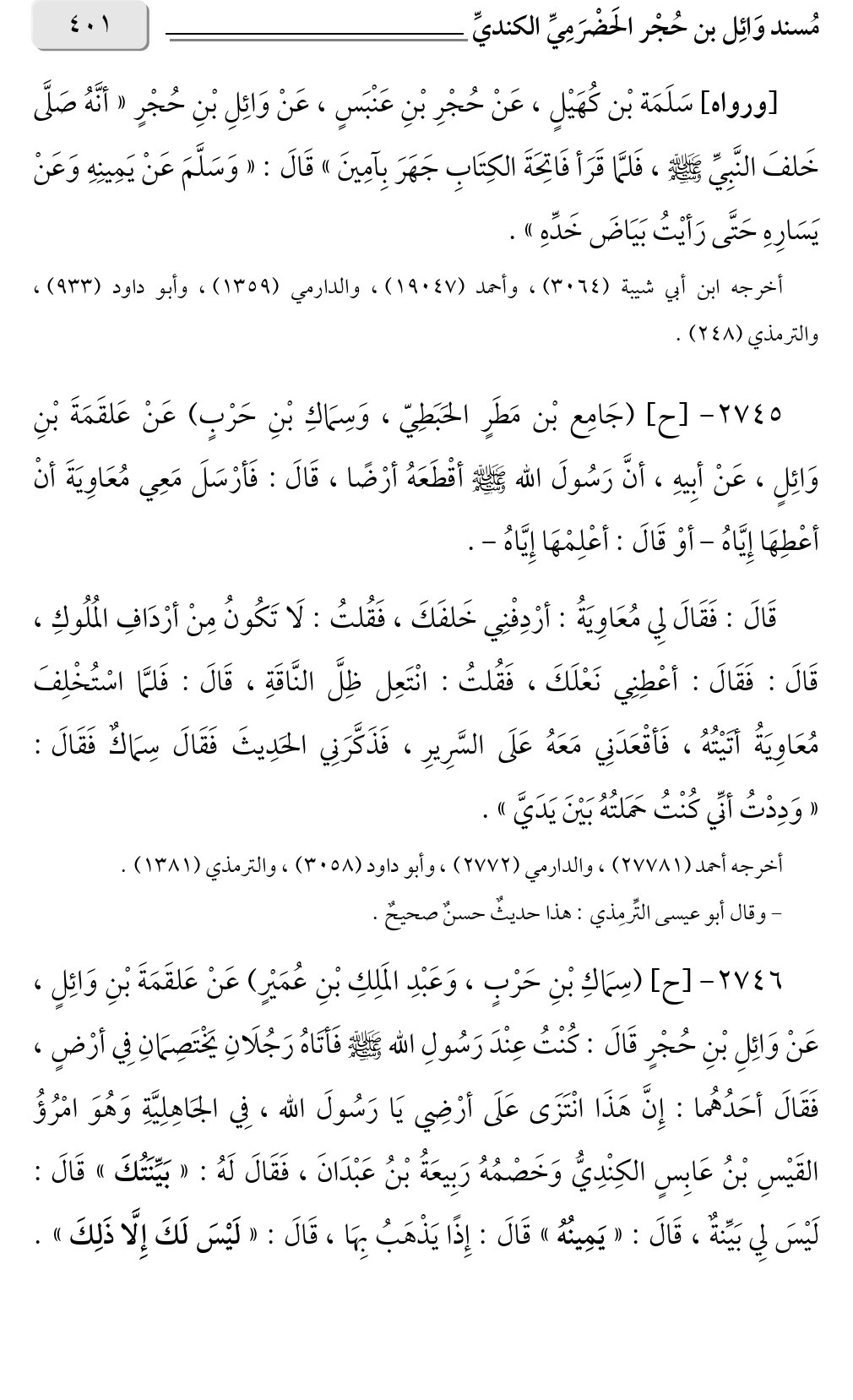 ٢٧٤٦ - [ح] (سِمَاكِ بْنِ حَرْبٍ، وَعَبْدِ المَلِكِ بْنِ عُمَيْرٍ) عَنْ عَلقَمَةَ بْنِ وَائِلٍ، عَنْ وَائِلِ بْنِ حُجْرٍ قَالَ: كُنْتُ عِنْدَ رَسُولِ الله صلى الله عليه وسلم فَأتَاهُ رَجُلَانِ يَخْتَصِمَانِ فِي أرْضٍ، فَقَالَ أحَدُهُما: إِنَّ هَذَا انْتَزَى عَلَى أرْضِي يَا رَسُولَ الله، فِي الجَاهِلِيَّةِ وَهُوَ امْرُؤُ القَيْسِ بْنُ عَابِسٍ الكِنْدِيُّ وَخَصْمُهُ رَبِيعَةُ بْنُ عَبْدَانَ، فَقَالَ لَهُ: «بَيِّنَتُكَ» قَالَ: لَيْسَ لِي بَيِّنةٌ، قَالَ: «يَمِينُهُ» قَالَ: إِذًا يَذْهَبُ بِهَا، قَالَ: «لَيْسَ لَكَ إِلَّا ذَلِكَ».