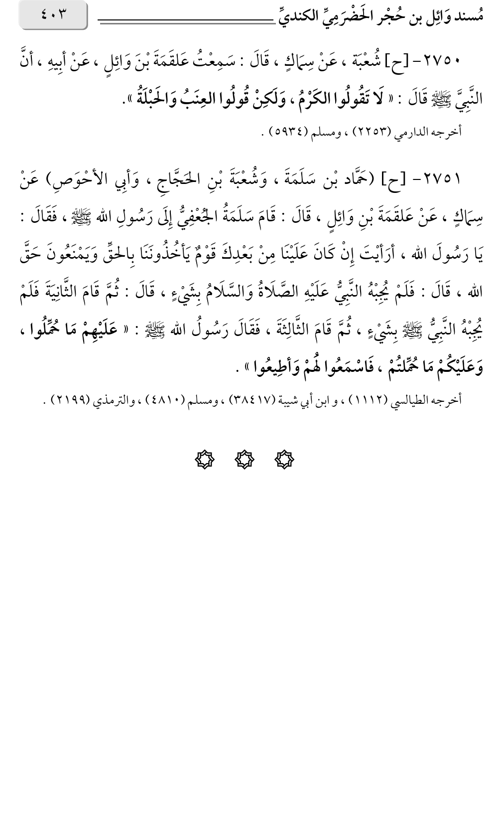 ٢٧٥٠ - [ح] شُعْبَة، عَنْ سِمَاكٍ، قَالَ: سَمِعْتُ عَلقَمَةَ بْنَ وَائِلٍ، عَنْ أبِيهِ، أنَّ النَّبِيَّ صلى الله عليه وسلم قَالَ: «لَا تَقُولُوا الكَرْمُ، وَلَكِنْ قُولُوا العِنَبُ وَالحَبْلَةُ».