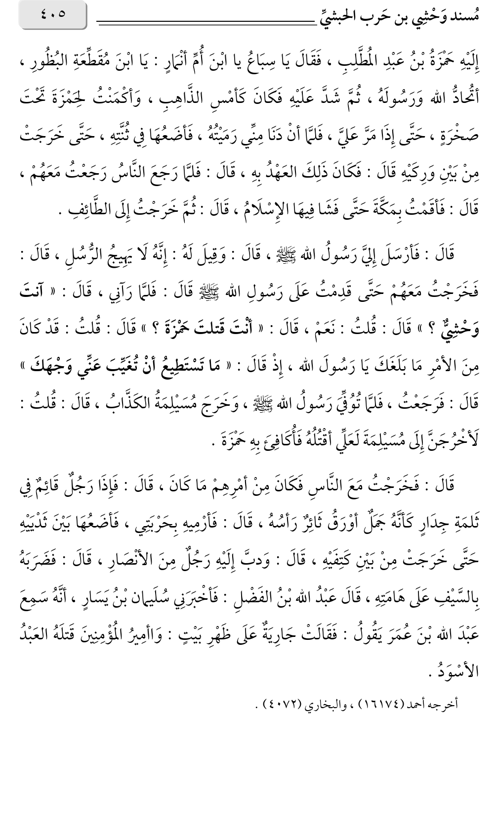 إِلَيْهِ حَمْزَةُ بْنُ عَبْدِ المُطَّلِبِ، فَقَالَ يَا سِبَاعُ يا ابْنَ أُمِّ أنْمَارٍ: يَا ابْنَ مُقَطِّعَةِ البُظُورِ، أتُحادُّ الله وَرَسُولَهُ، ثُمَّ شَدَّ عَلَيْهِ فَكَانَ كَأمْسِ الذَّاهِبِ، وَأكْمَنْتُ لحَمْزَةَ تَحْتَ صَخْرَةٍ، حَتَّى إِذَا مَرَّ عَليَّ، فَلمَّا أنْ دَنَا مِنِّي رَمَيْتُهُ، فَأضَعُهَا فِي ثُنَّتِهِ، حَتَّى خَرَجَتْ مِنْ بَيْنِ وَرِكَيْهِ قَالَ: فَكَانَ ذَلِكَ العَهْدُ بِهِ، قَالَ: فَلمَّا رَجَعَ النَّاسُ رَجَعْتُ مَعَهُمْ، قَالَ: فَأقَمْتُ بِمَكَّةَ حَتَّى فَشَا فِيهَا الإِسْلَامُ، قَالَ: ثُمَّ خَرَجْتُ إِلَى الطَّائِفِ.