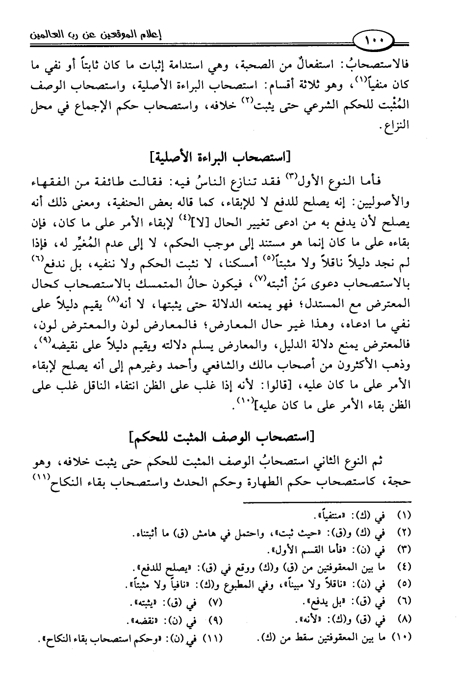 ثم النوع الثاني استصحابُ الوصف المثبت للحكم حتى يثبت خلافه، وهو حجة، كاستصحاب حكم الطهارة وحكم الحدث واستصحاب بقاء النكاح (١١)