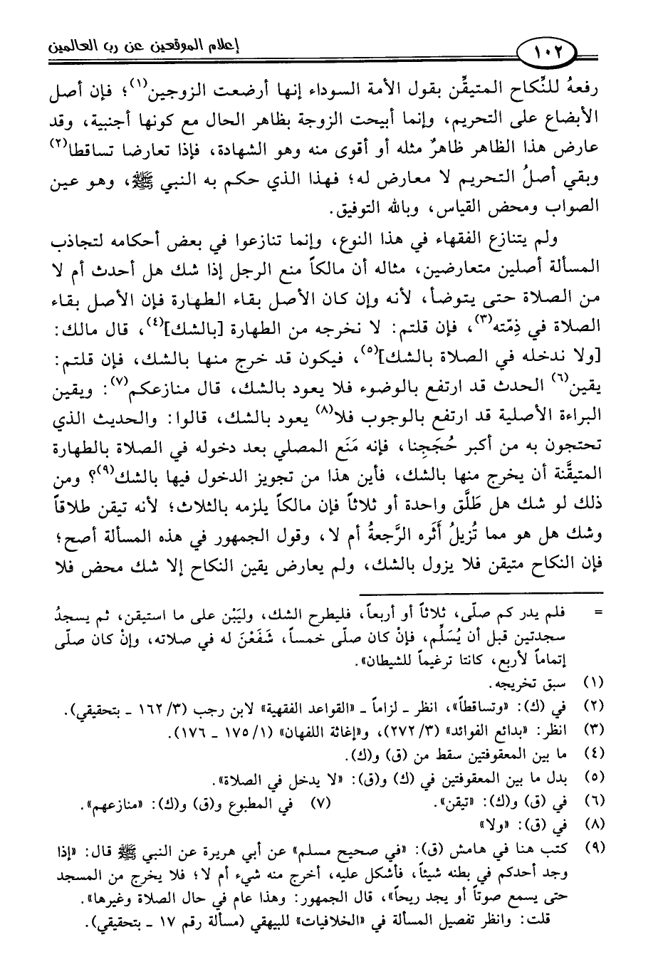 ولم يتنازع الفقهاء في هذا النوع، وإنما تنازعوا في بعض أحكامه لتجاذب المسألة أصلين متعارضين، مثاله أن مالكًا منع الرجل إذا شك هل أحدث أم لا من الصلاة حتى يتوضأ، لأنه وإن كان الأصل بقاء الطهارة فإن الأصل بقاء الصلاة في ذِمّته (٣)، فإن قلتم: لا نخرجه من الطهارة [بالشك] (٤)، قال مالك: [ولا ندخله في الصلاة بالشك] (٥)، فيكون قد خرج منها بالشك، فإن قلتم: يقين (٦) الحدث قد ارتفع بالوضوء فلا يعود بالشك، قال منازعكم (٧): وبقين البراءة الأصلية قد ارتفع بالوجوب فلا (٨) يعود بالشك، قالوا: والحديث الذي تحتجون به من أكبر حُجَجِنا، فإنه مَنَع المصلي بعد دخوله في الصلاة بالطهارة المتيقَّنة أن يخرج منها بالشك، فأين هذا من تجويز الدخول فيها بالشك (٩)؟ ومن ذلك لو شك هل طَلَّق واحدة أو ثلاثًا فإن مالكًا يلزمه بالثلاث؛ لأنه تيقن طلاقًا وشك هل هو ممَّا تُزيلُ أَثَره الرَّجعةُ أم لا، وقول الجمهور في هذه المسألة أصح؛ فإن النكاح متيقن فلا يزول بالشك، ولم يعارض يقين النكاح إلا شك محض فلا