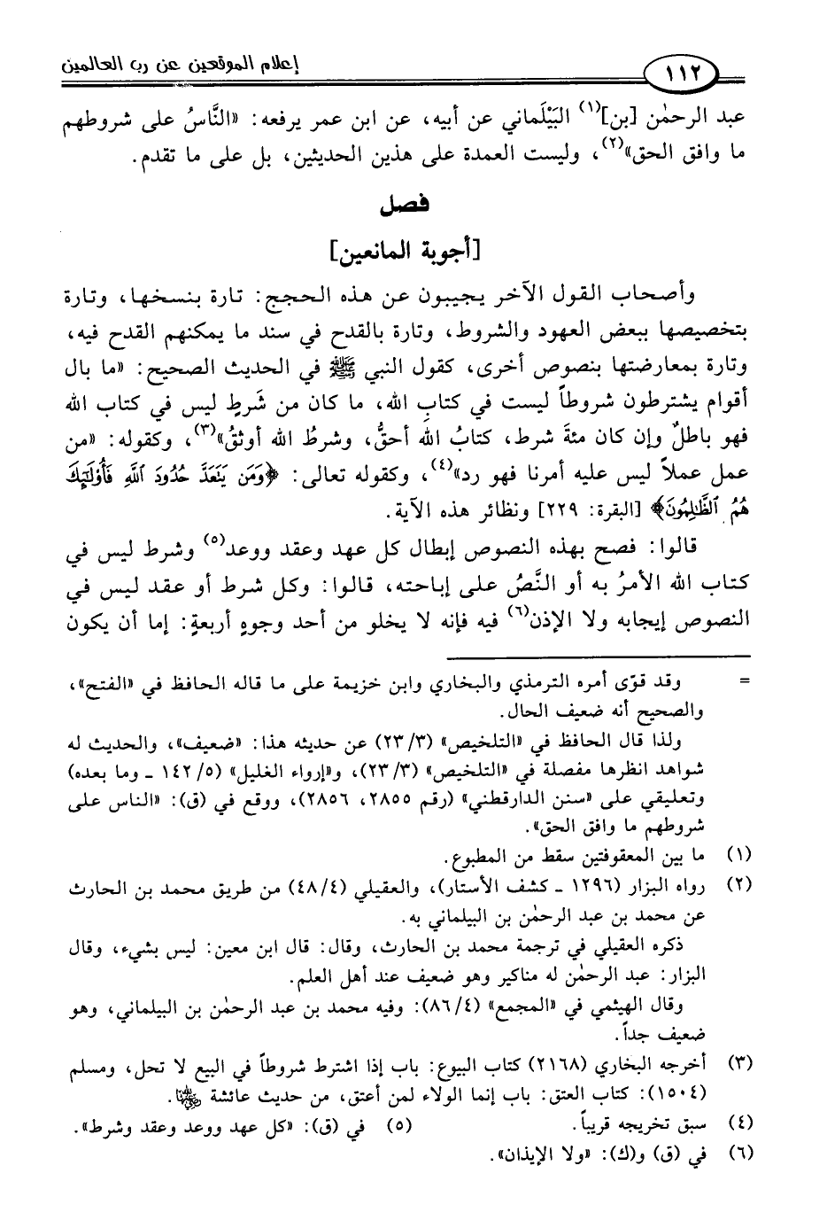وأصحاب القول الآخر يجيبون عن هذه الحجج: تارة بنسخها، وتارة بتخصيصها ببعض العهود والشروط، وتارة بالقدح في سند ما يمكنهم القدح فيه، وتارة بمعارضتها بنصوص أخرى، كقول النبي -صلى اللَّه عليه وسلم- في الحديث الصحيح: "ما بال أقوام يشترطون شروطًا ليست في كتاب اللَّه، ما كان من شَرطٍ ليس في كتاب اللَّه فهو باطلٌ وإن كان مئةَ شرط، كتابُ اللَّه أحق، وشرطُ اللَّه أوثقُ" (٣)، وكقوله: "من عمل عملًا ليس عليه أمرنا فهو رد" (٤)، وكقوله تعالى: {وَمَنْ يَتَعَدَّ حُدُودَ اللَّهِ فَأُولَئِكَ هُمُ الظَّالِمُونَ (٢٢٩)} [البقرة: ٢٢٩] ونظائر هذه الآية.