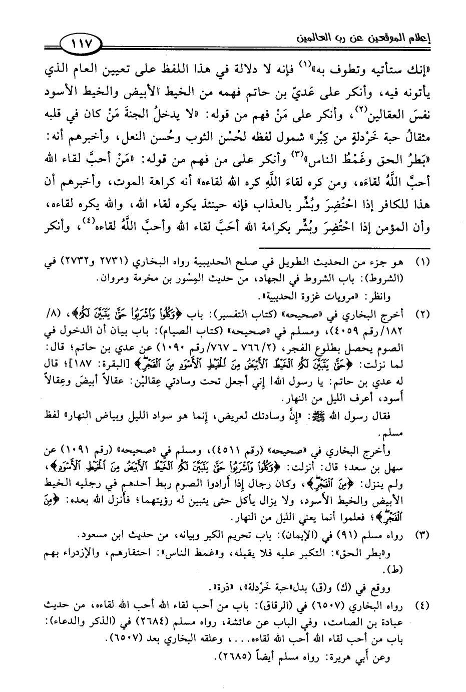 "إنك ستأتيه وتطوف به" (١) فإنه لا دلالة في هذا اللفظ على تعيين العام الذي يأتونه فيه، وأنكر على عديّ بن حاتم فهمه من الخيط الأبيض والخيط الأسود نفسَ العقالين (٢)، وأنكر على مَنْ فهم من قوله: "لا يدخلُ الجنةَ مَنْ كان في قلبه مثقالُ حبة خَرْدلةٍ من كِبْر" شمول لفظه لحسْن الثوب وحُسن النعل، وأخبرهم أنه: "بَطرُ الحق وغَمطُ الناس" (٣) وأنكر على من فهم من قوله: "مَنْ أحبَّ لقاء اللَّه أحبَّ اللَّه لقاءَه، ومن كره لقاءَ اللَّهِ كره اللَّه لقاءه" أنه كراهة الموت، وأخبرهم أن هذا للكافر إذا احْتُضِرَ وبُشِّر بالعذاب فإنه حينئذ يكره لقاء اللَّه، واللَّه يكره لقاءه، وأن المؤمن إذا احْتُضِرَ وبُشِّر بكرامة اللَّه أحَبَّ لقاء اللَّه وأحبَّ اللَّه لقاءه (٤)، وأنكر