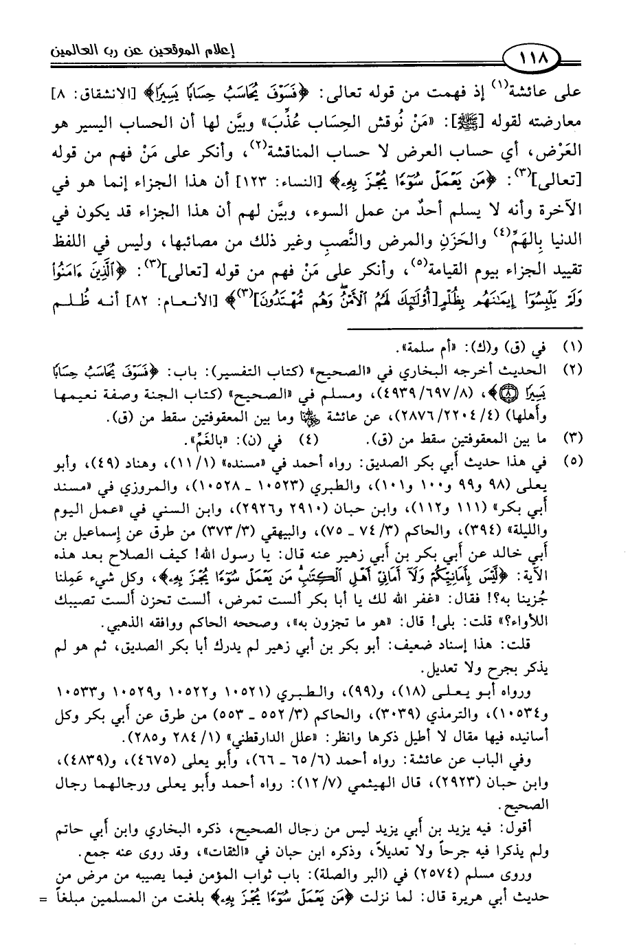على عائشة (١) إذ فهمت من قوله تعالى: {فَسَوْفَ يُحَاسَبُ حِسَابًا يَسِيرًا (٨)} [الانشقاق: ٨] معارضته لقوله [-صلى اللَّه عليه وسلم-]: "مَنْ نُوقش الحِسَاب عُذِّبَ" وبيَّن لها أن الحساب اليسير هو العَرْض، أي حساب العرض لا حساب المناقشة (٢)، وأنكر على مَنْ فهم من قوله [تعالى] (٣): {مَنْ يَعْمَلْ سُوءًا يُجْزَ بِهِ} [النساء: ١٢٣]، أن هذا الجزاء إنما هو في الآخرة وأنه لا يسلم أحدٌ من عمل السوء، وبيَّن لهم أن هذا الجزاء قد يكون في الدنيا بِالهَمِّ (٤) والحَزَنِ والمرض والنَّصبِ وغير ذلك من مصائبها، وليس في اللفظ تقييد الجزاء بيوم القيامة (٥)، وأنكر على مَنْ فهم من قوله [تعالى] (٣): {الَّذِينَ آمَنُوا وَلَمْ يَلْبِسُوا إِيمَانَهُمْ بِظُلْمٍ [أُولَئِكَ لَهُمُ الْأَمْنُ وَهُمْ مُهْتَدُونَ] (٣)} [الأنعام: ٨٢] أنه ظُلم