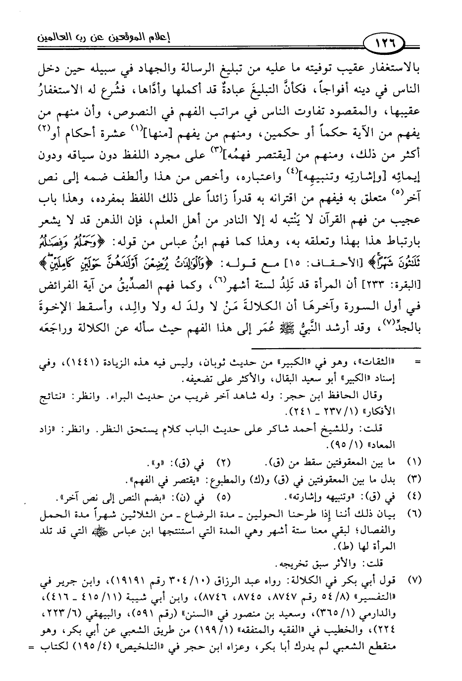 بالاستغفار عقيب توفيته ما عليه من تبليغ الرسالة والجهاد في سبيله حين دخل الناس في دينه أفواجًا، فكأنَّ التبليغَ عبادةٌ قد أكملها وأدَّاها، فشُرع له الاستغفارُ عقيبها، والمقصود تفاوت الناس في مراتب الفهم في النصوص، وأن منهم من يفهم من الآية حكمًا أو حكمين، ومنهم من يفهم [منها] (١) عشرة أحكام أو (٢) أكثر من ذلك، ومنهم من [يقتصر فهمُه] (٣) على مجرد اللفظ دون سياقه ودون إيمائِه [وإشارته وتنبيهِه] (٤) واعتباره، وأخص من هذا وألطف ضمه إلى نص آخر (٥) متعلق به فيفهم من اقترانه به قدرًا زائدًا على ذلك اللفظ بمفرده، وهذا باب عجيب من فهم القرآن لا يَنْتبه له إلا النادر من أهل العلم، فإن الذهن قد لا يشعر بارتباط هذا بهذا وتعلقه به، وهذا كما فهم ابنُ عباس من قوله: {وَحَمْلُهُ وَفِصَالُهُ ثَلَاثُونَ شَهْرًا} [الأحقاف: ١٥] مع قوله: {وَالْوَالِدَاتُ يُرْضِعْنَ أَوْلَادَهُنَّ حَوْلَيْنِ كَامِلَيْنِ} [البقرة: ٢٣٣] أن المرأة قد تَلِدُ لستة أشهر (٦)، وكما فهم الصدِّيقُ من آية الفرائض في أول السورة وآخرهَا أن الكلالةَ مَنْ لا ولدَ له ولا والِد، وأسقط الإخوةَ بالجدِّ (٧)، وقد أرشد النَّبيُّ -صلى اللَّه عليه وسلم- عُمَر إلى هذا الفهم حيث سأله عن الكلالة وراجَعَه