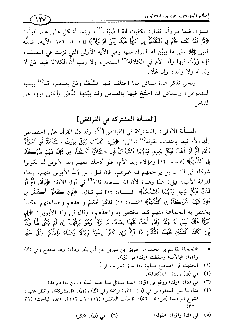 المسألة الأولى: [المشتركة في الفرائض] (٤)، وقد دل القرآن على اختصاص ولَدِ الأم فيها بالثلث، بقوله (٥) تعالى: {وَإِنْ كَانَ رَجُلٌ يُورَثُ كَلَالَةً أَوِ امْرَأَةٌ وَلَهُ أَخٌ أَوْ أُخْتٌ فَلِكُلِّ وَاحِدٍ مِنْهُمَا السُّدُسُ فَإِنْ كَانُوا أَكْثَرَ مِنْ ذَلِكَ فَهُمْ شُرَكَاءُ فِي الثُّلُثِ} [النساء: ١٢] وهؤلاء ولد الأم، فلو أدخلنا معهم ولد الأبوين لم يكونوا شركاء في الثلث بل يزاحمهم فيه غيرهم، فإن قيل: بل وَلدُ الأبوين منهم، إلغاء لقرابة الأب، قيل: هذا وهم، لأن اللَّه سبحانه قال (٦) في أول الآية: {وَلَهُ أَخٌ أَوْ أُخْتٌ فَلِكُلِّ وَاحِدٍ مِنْهُمَا السُّدُسُ} [النساء: ١٢] ثم قال: {فَإِنْ كَانُوا أَكْثَرَ مِنْ ذَلِكَ فَهُمْ شُرَكَاءُ فِي الثُّلُثِ} [النساء: ١٢] فذَكَرَ حُكمَ واحدهم وجماعتهم حكمًا يختص به الجماعة منهم كما يختص به واحدُهُم، وقال في ولد الأبوين: {إِنِ امْرُؤٌ هَلَكَ لَيْسَ لَهُ وَلَدٌ وَلَهُ أُخْتٌ فَلَهَا نِصْفُ مَا تَرَكَ وَهُوَ يَرِثُهَا إِنْ لَمْ يَكُنْ لَهَا وَلَدٌ فَإِنْ كَانَتَا اثْنَتَيْنِ فَلَهُمَا الثُّلُثَانِ مِمَّا تَرَكَ وَإِنْ كَانُوا إِخْوَةً رِجَالًا وَنِسَاءً فَلِلذَّكَرِ مِثْلُ حَظِّ