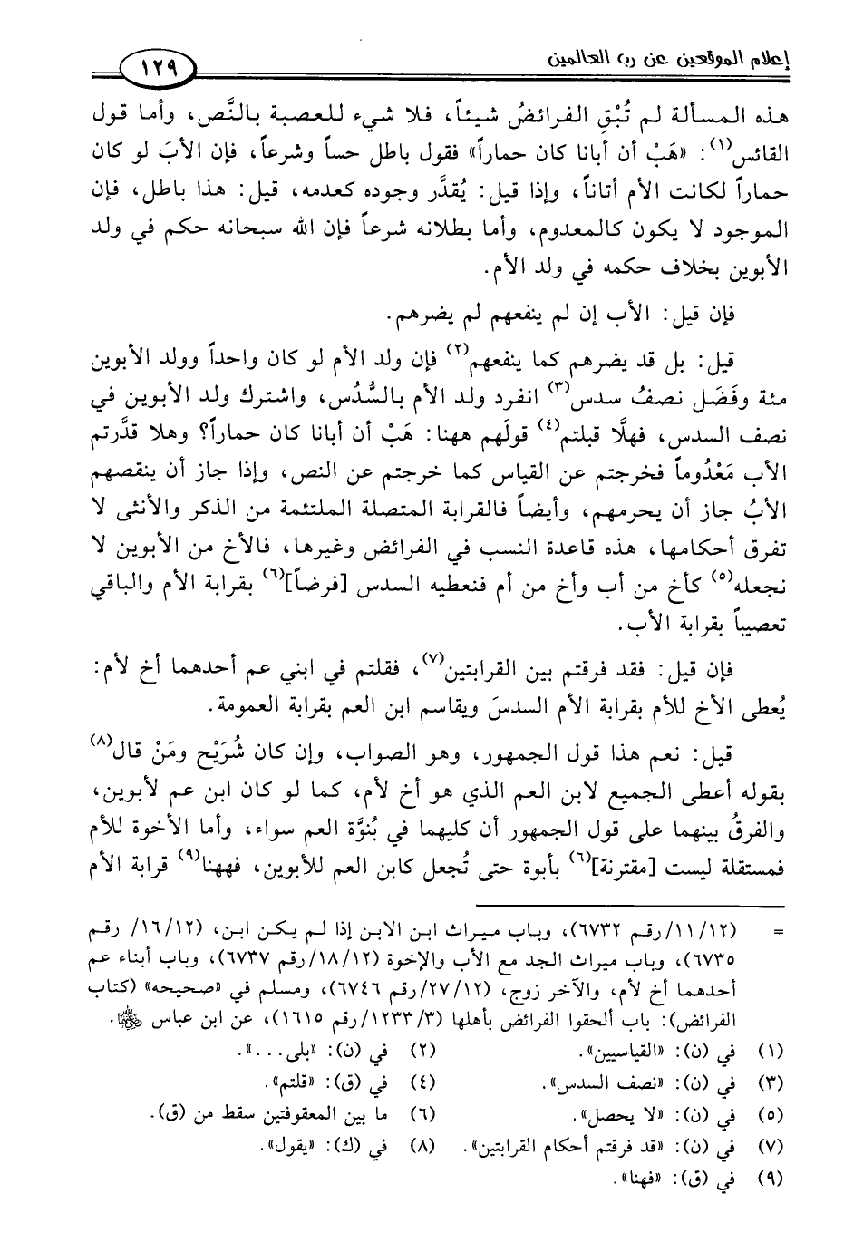 هذه المسألة لم تُبْقِ الفرائضُ شيئًا، فلا شيء للعصبة بالنَّص، وأما قول القائس (١): "هَبْ أن أبانا كان حمارًا" فقول باطل حسًا وشرعًا، فإن الأبَ لو كان حمارًا لكانت الأم أتانًا، وإذا قيل: يُقدَّر وجوده كعدمه، قيل: هذا باطل، فإن الموجود لا يكون كالمعدوم، وأما بطلانه شرعًا فإن اللَّه سبحانه حكم في ولد الأبوين بخلاف حكمه في ولد الأم.