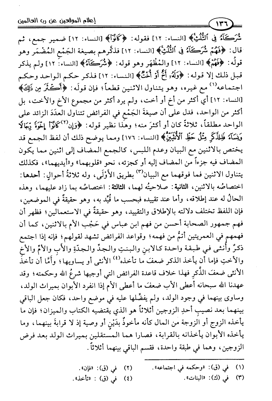 شُرَكَاءُ فِي الثُّلُثِ} [النساء: ١٢] فقوله: {كَانُوا} [النساء: ١٢] ضمير جمع، ثم قال: {فَهُمْ شُرَكَاءُ فِي الثُّلُثِ} [النساء: ١٢] فذكَرهم بصيغة الجَمْعِ المُضْمَر وهو قولُه: {فَهُمْ} [النساء: ١٢] والمْظْهَر وهو قوله: {شُرَكَاءُ} [النساء: ١٢] ولم يذكر قبل ذلك إلا قوله: {وَلَهُ أَخٌ أَوْ أُخْتٌ} [النساء: ١٢] فذكر حكم الواحد وحكم اجتماعه (١) مع غيره، وهو يتناول الاثنين قطعًا؛ فإن قولَه: {أَكْثَرَ مِنْ ذَلِكَ} [النساء: ١٢] أي أكثر من أخ أو أخت، ولم يرد أكثر من مجموع الأخ والأخت، بل أكثر من الواحد، فدل على أن صيغةَ الجَمْعِ في الفرائض تتناول العدَدَ الزائد على الواحد مطلقًا، ثلاثةً كان أو أكثرَ منه؛ وهذا نظير قوله: {وَإِنْ (٢) كَانُوا إِخْوَةً رِجَالًا وَنِسَاءً فَلِلذَّكَرِ مِثْلُ حَظِّ الْأُنْثَيَيْنِ} [النساء: ١٧٦] ومما يوضح ذلك أن لفظ الجمع قد يختص بالاثنين مع البيان وعدم اللبس، كالجمع المضاف إلى اثنين مما يكون المضاف فيه جزءًا من المضاف إليه أو كجزئه، نحو "قلوبهما" و"أيديهما"، فكذلك يتناول الاثنين فما فوقهما مع البيان (٣) بطريق الأَوْلَى، وله ثلاثةُ أحوالٍ: أحدها: اختصاصُه بالاثنين، الثانية: صلاحيتُه لهما، الثالثة: اختصاصُه بما زاد عليهما، وهذه الحالُ له عند إطلاقه، وأما عند تقييده فبحسب ما قُيِّد به، وهو حقيقةٌ في الموضعين، فإن اللفظ تختلف دلالته بالإطلاق والتقييد، وهو حقيقةٌ في الاستعمالين؛ فظهر أن فهم جمهور الصحابة أحسن من فهم ابن عباس في حَجْب الأم بالاثنين، كما أن فهمهم في العمريتين أتمُّ من فهمه؛ وقواعد الفرائض تشهد لقولهم؛ فإنه إذا اجتمع ذكرٌ وأنثى في طبقة واحدة كالابنِ والبنتِ والجدِّ والجدّةِ والأَبِ والأمِّ والأخِ والأختِ فإما أن يأخذ الذكر ضعفَ ما تأخذه (٤) الأنثى أو يساويها؛ وأَمَّا أن تأخذ الأنثى ضعفَ الذَّكرِ فهذا خلاف قاعدة الفرائض التي أوجبها شرعُ اللَّه وحكمته؛ وقد عهدنا اللَّه سبحانه أعطى الأب ضعفَ ما أعطى الأم إذا انفرد الأبوان بميراث الولد، وساوى بينهما في وجود الولد، ولم يفضِّلها عليه في موضع واحد، فكان جعل الباقي بينهما بعد نصيبِ أحدِ الزوجين أثلاثًا هو الذي يقتضيه الكتاب والميزان؛ فإن ما يأخذه الزوج أو الزوجة من المال كأنه مأخوذٌ بدَيْنٍ أو وصية إذ لا قرابةَ بينهما، وما يأخذه الأبوان يأخذانه بالقرابة، فصارا هما المستقلين بميراث الولد بعد فرض الزوجين، وهما في طبقة واحدة، فقسم الباقي بينهما أثلاثًا.