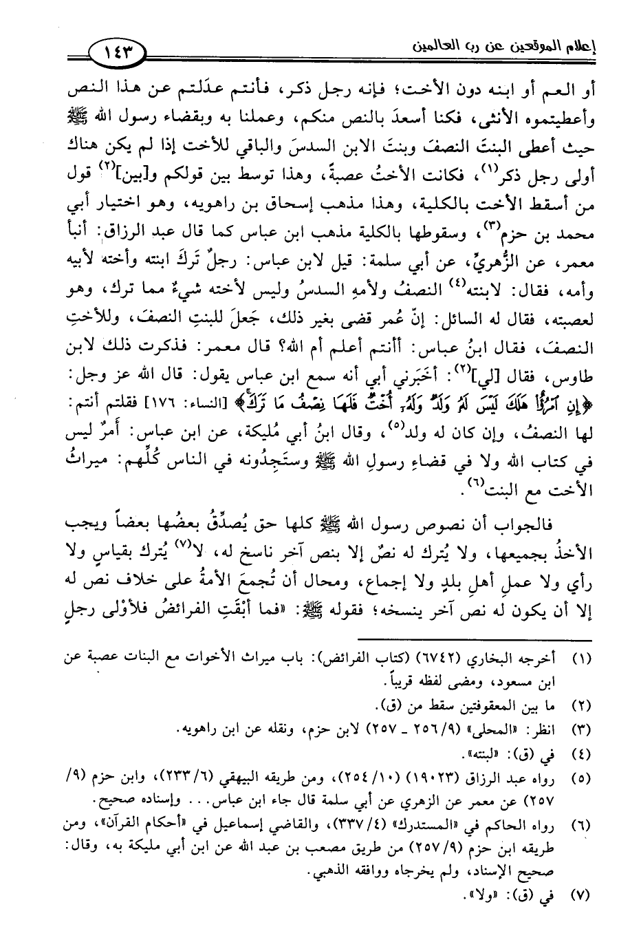 أو العم أو ابنه دون الأخت؛ فإنه رجل ذكر، فأنتم عدَلتم عن هذا النص وأعطيتموه الأنثى، فكنا أسعدَ بالنص منكم، وعملنا به وبقضاء رسول اللَّه -صلى اللَّه عليه وسلم- حيث أعطى البنتَ النصفَ وبنتَ الابن السدسَ والباقي للأخت إذا لم يكن هناك أولى رجل ذكر (١)، فكانت الأختُ عصبةَ، وهذا توسط بين قولكم و [بين] (٢) قول من أسقط الأخت بالكلية، وهذا مذهب إسحاق بن راهويه، وهو اختيار أبي محمد بن حزم (٣)، وسقوطها بالكلية مذهب ابن عباس كما قال عبد الرزاق: أنبا معمر، عن الزُّهريِّ، عن أبي سلمة: قيل لابن عباس: رجلٌ تَركَ ابنته وأخته لأبيه وأمه، فقال: لابنته (٤) النصفُ ولأمهِ السدسُ وليس لأخته شيءٌ مما ترك، وهو لعصبته، فقال له السائل: إنّ عُمر قضى بغير ذلك، جَعلَ للبنتِ النصفَ، وللأختِ النصفَ، فقال ابنُ عباس: أأنتم أعلم أم اللَّه؟ قال معمر: فذكرت ذلك لابن طاوس، فقال [لي] (٢): أخَبَرني أبي أنه سمع ابن عباس يقول: قال اللَّه عز وجل: {إِنِ امْرُؤٌ هَلَكَ لَيْسَ لَهُ وَلَدٌ وَلَهُ أُخْتٌ فَلَهَا نِصْفُ مَا تَرَكَ} [النساء: ١٧٦] فقلتم أنتم: لها النصفُ، وإن كان له ولد (٥)، وقال ابنُ أبي مُليكة، عن ابن عباس: أَمرٌ ليس في كتاب اللَّه ولا في قضاءِ رسولِ اللَّه -صلى اللَّه عليه وسلم- وستَجِدُونه في الناس كُلِّهم: ميراثُ الأخت مع البنت (٦).