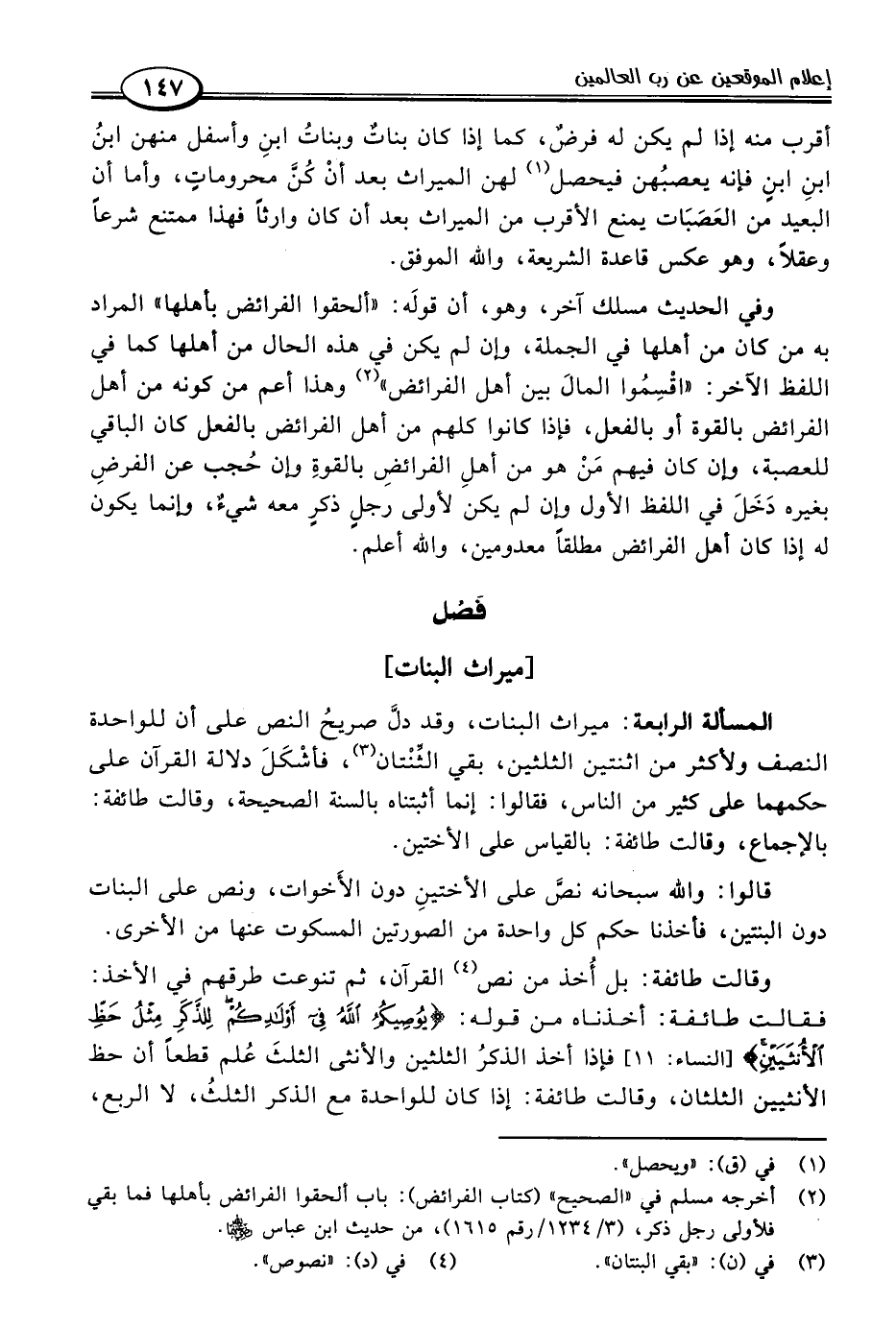 المسألة الرابعة: ميراث البنات، وقد دلَّ صريحُ النص على أن للواحدة النصف ولأكثر من اثنتين الثلثين، بقي الثِّنْتان (٣)، فأشْكَلَ دلالة القرآن على حكمهما على كثير من الناس، فقالوا: إنما أثبتناه بالسنة الصحيحة، وقالت طائفة: بالإجماع، وقالت طائفة: بالقياس على الأختين.