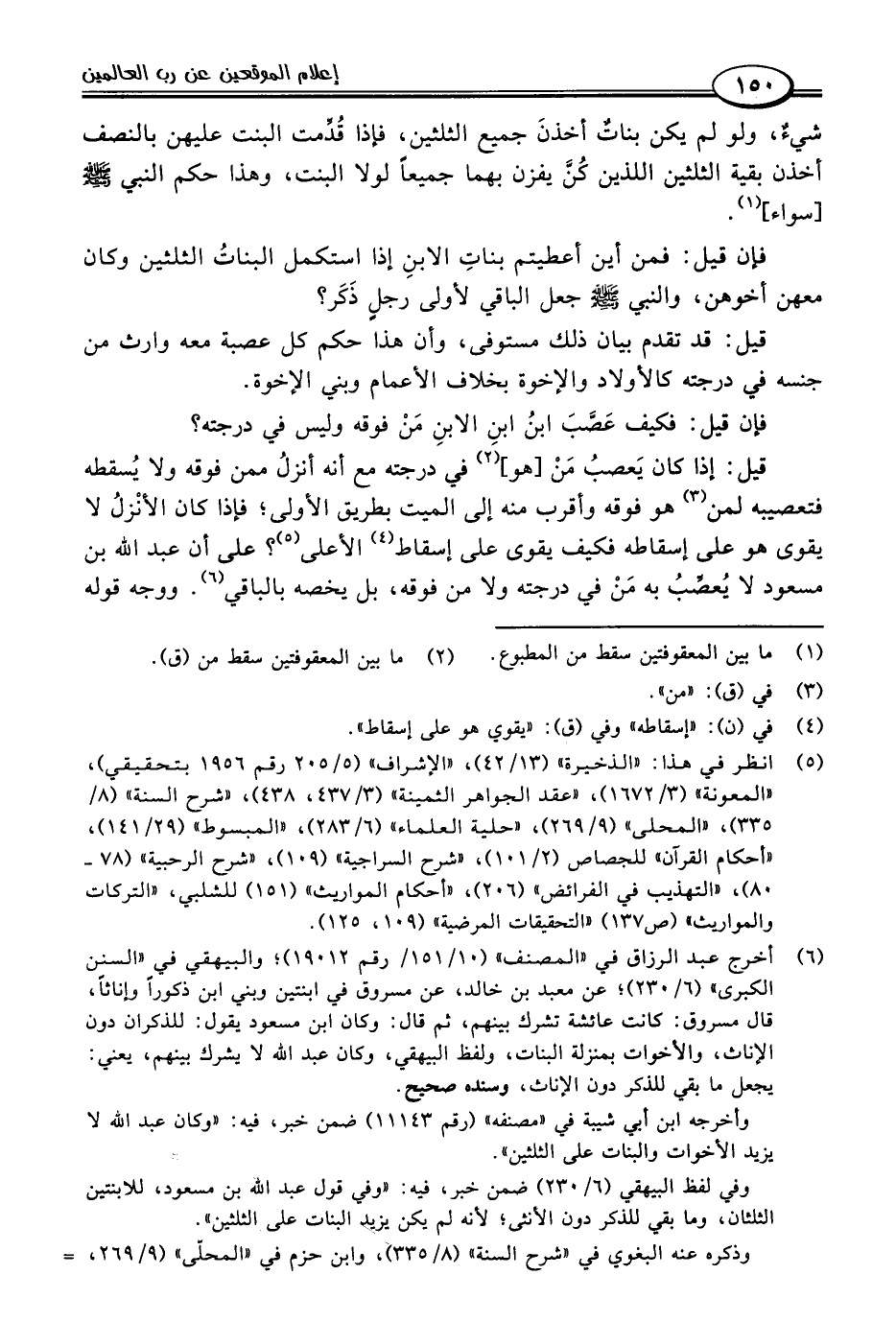 (٦) أخرج عبد الرزاق في "المصنف" (١٥/ ١٥١/ رقم ١٩٠١٢)؛ والبيهقي في "السنن الكبرى" (٦/ ٢٣٥)؛ عن معبد بن خالد، عن مسروق في ابنتين وبني ابن ذكورًا وإناثًا، قال مسروق: كانت عائشة تشرك بينهم، ثم قال: وكان ابن مسعود يقول: للذكران دون الأناث، والأخوات بمنزلة البنات، ولفظ البيهقي، وكان عبد اللَّه لا يشرك بينهم، يعني: يجعل ما بقي للذكر دون الإناث، وسنده صحيح.