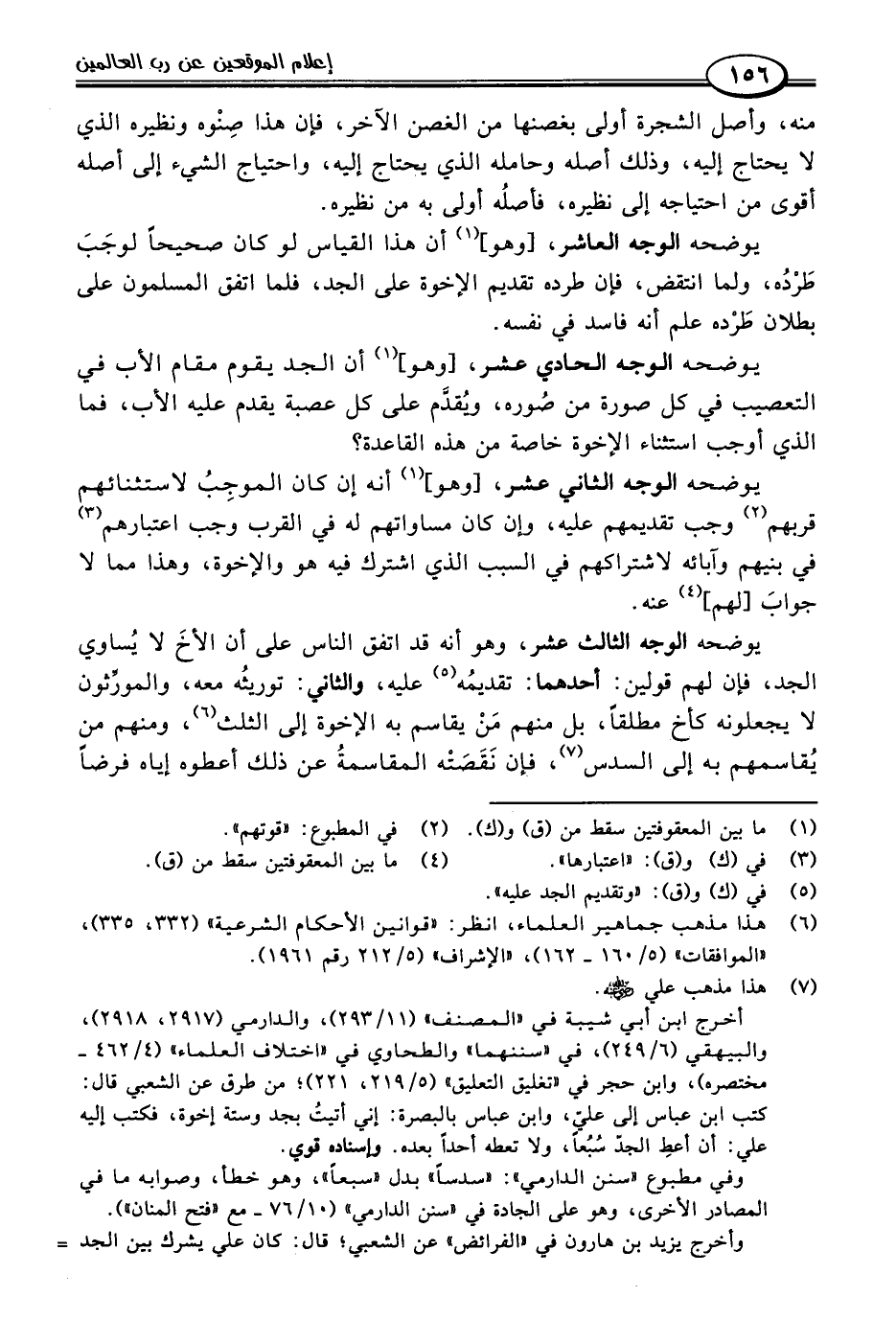 يوضحه الوجه الثالث عشر، وهو أنه قد اتفق الناس على أن الأخَ لا يُساوي الجد، فإن لهم قولين: أحدهما: تقديمُه (٥) عليه، والثاني: توريثُه معه، والمورِّثون لا يجعلونه كأخ مطلقًا، بل منهم مَنْ يقاسم به الإخوة إلى الثلث (٦)، ومنهم من يُقاسمهم به إلى السدس (٧)، فإن نَقَصَتْه المقاسمةُ عن ذلك أعطوه إياه فرضًا