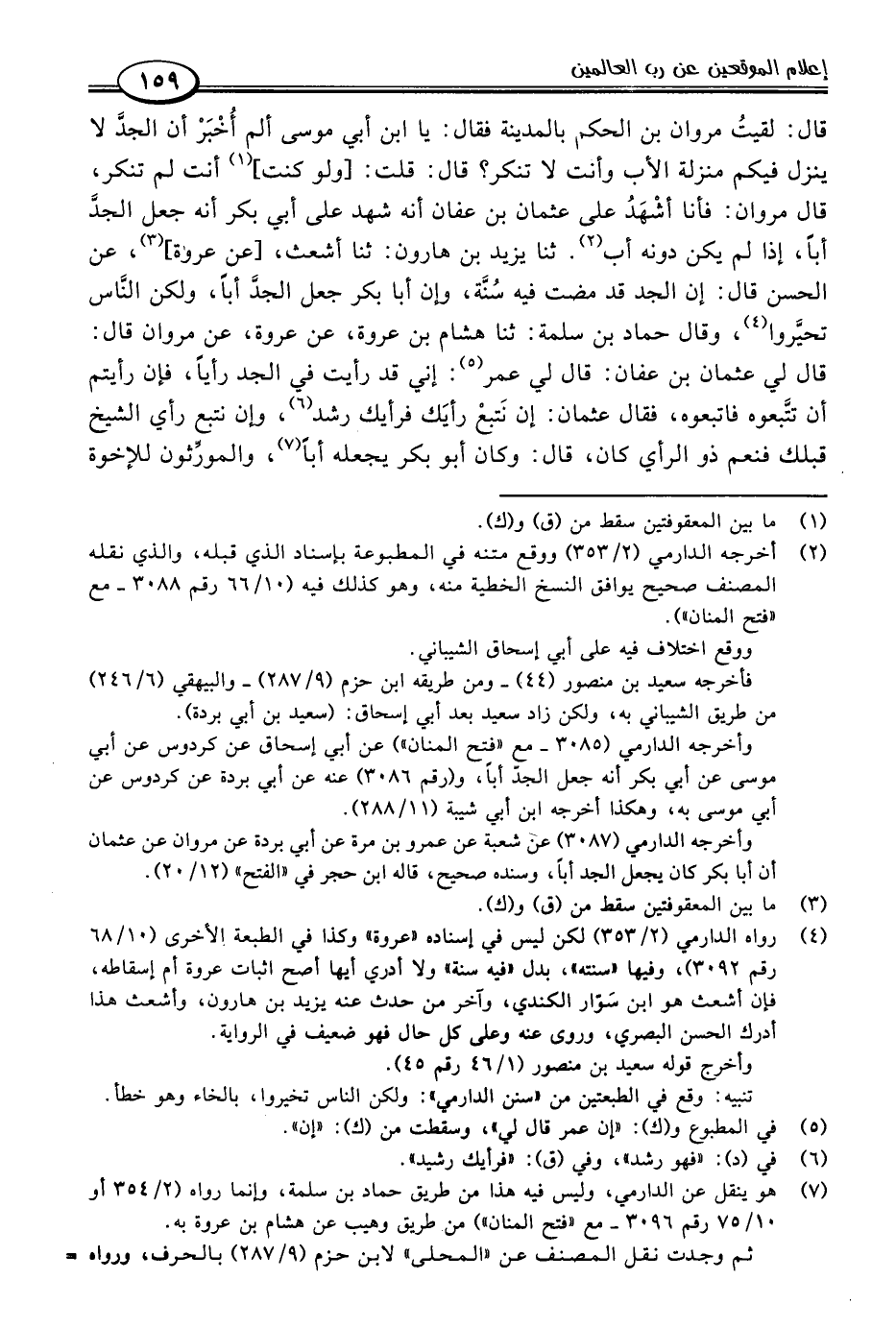 قال: لقيتُ مروان بن الحكم بالمدينة فقال: يا ابن أبي موسى ألم أُخْبَرْ اْن الجدَّ لا ينزل فيكم منزلة الأب وأنت لا تنكر؟ قال: قلت: [ولو كنت] (١) أنت لم تنكر، قال مروان: فأنا أشْهَدُ على عثمان بن عفان أنه شهد على أبي بكر أنه جعل الجدَّ أبًا، إذا لم يكن دونه أب (٢). ثنا يزيد بن هارون: ثنا أشعث، [عن عروة] (٣)، عن الحسن قال: إن الجد قد مضت فيه سُنَّة، وإن أبا بكر جعل الجدَّ أبًا، ولكن الناس تحيَّروا (٤)، وقال حماد بن سلمة: ثنا هشام بن عروة، عن عروة، عن مروان قال: قال لي عثمان بن عفان: قال لي عمر (٥): إني قد رأيت في الجد رأيًا، فإن رأيتم أن تتَّبعوه فاتبعوه، فقال عثمان: إن نَتبعْ رأيَك فرأيك رشد (٦)، وإن نتبع رأي الشيخ قبلك فنعم ذو الرأي كان، قال: وكان أبو بكر يجعله أبًا (٧)، والمورِّثون للإخوة