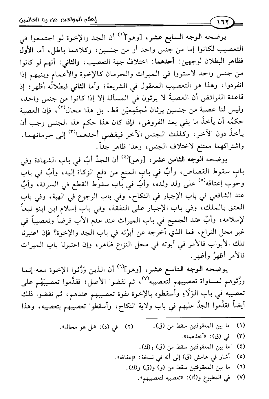 يوضحه الوجه التاسع عشر، [وهو] (٦) أن الذين وَرَّثوا الإخوة معه إنما ورَّثوهم لمساواة تعصيبهم لتعصيبه (٧)، ثم نقضوا الأصل، فقدَّموا تعصيبَهُم على تعصيبه في باب الوَلَاءِ وأسقطوه بالإخوة لقوة تعصيبهم عندهم، ثم نقضوا ذلك أيضًا فقدَّموا الجدَّ عليهم في باب ولاية النكاح، وأسقطوا تعصيبهم بتعصيبه، وهذا