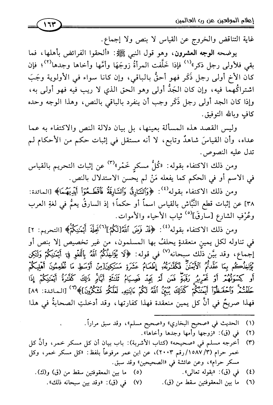 ومن ذلك الاكتفاء بقوله: "كُلٌّ مسكرٍ خَمْر" (٣) عن إثبات التحريم بالقياس في الاسم أو في الحكم كما يفعله مَنْ لم يحسن الاستدلال بالنص.