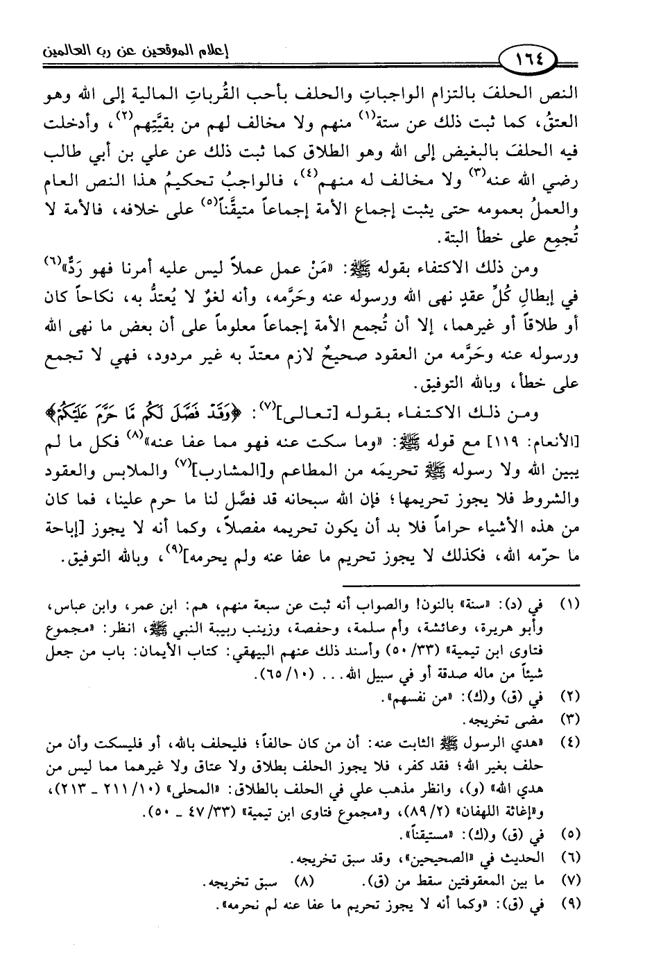 النص الحلفَ بالتزام الواجباتِ والحلف بأحب القُرباتِ المالية إلى اللَّه وهو العتقُ، كما ثبت ذلك عن ستة (١) منهم ولا مخالف لهم من بقيَّتِهم (٢)، وأدخلت فيه الحلفَ بالبغيض إلى اللَّه وهو الطلاق كما ثبت ذلك عن علي بن أبي طالب رضي اللَّه عنه (٣) ولا مخالف له منهم (٤)، فالواجبُ تحكيمُ هذا النص العام والعملُ بعمومه حتى يثبت إجماع الأمة إجماعًا متيفنًا (٥) على خلافه، فالأمة لا تُجمِع على خطأ البتة.